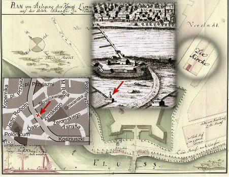 Tutaj też na planie z 1767 r. po raz pierwszy umieszczono już w 1682 r. wzniesiony pierwszy mały kościół tego przedmieścia.