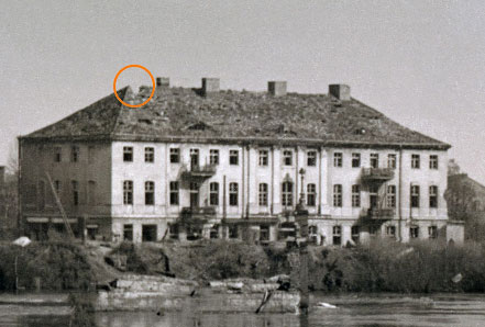 To zdjęcie z 1946 r. pokazuje stan budowli po zakończeniu wojny. Budynek, który w ostatnich godzinach wojny stracił jedynie szczyt północnego komina, został mimo to wyburzony w 1952 r.