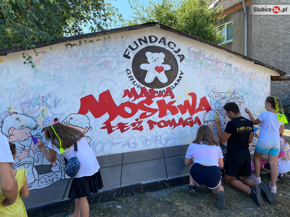 Na jej centralnej części zostało umieszczone hasło „Mała Moskwa też pomaga” oraz logo Fundacji Grupy Pomagamy. To właśnie ta organizacja poprosiła artystów o wykonanie muralu.