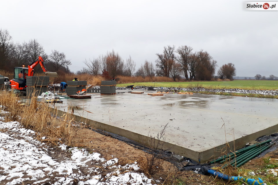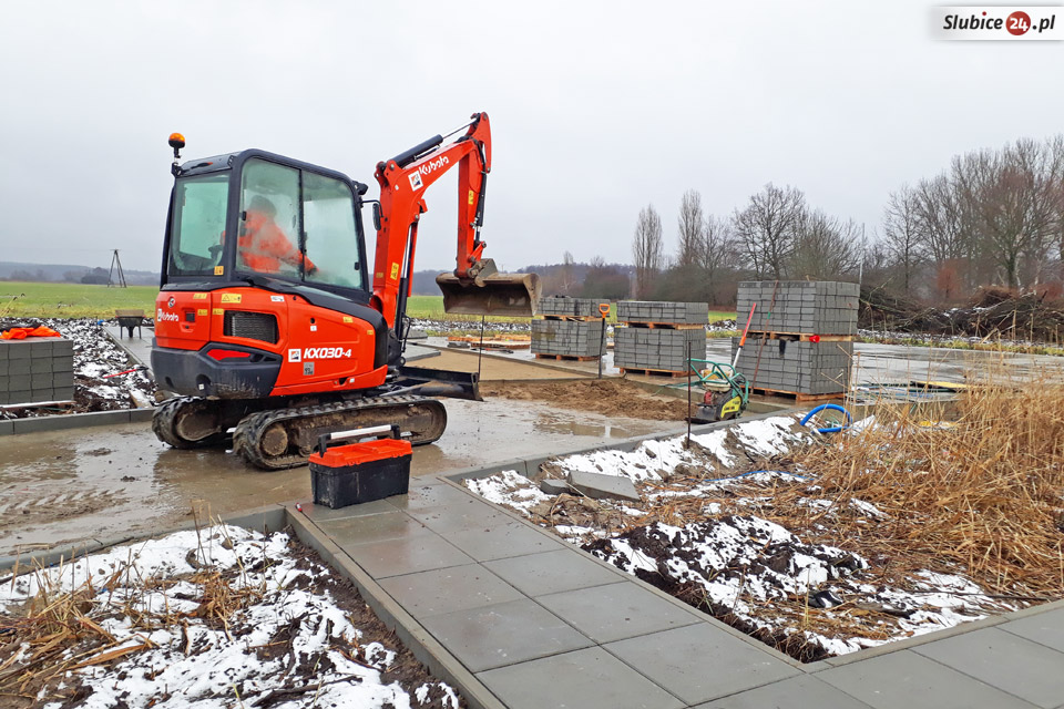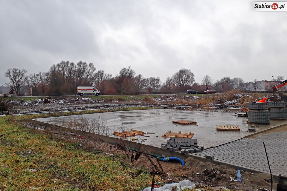 Choć pogoda nie rozpieszcza budowlańców, prace trwają. Wcześniej wylano już beton, obecnie utwardzana jest droga dojazdowa, układany jest chodnik przy lądowisku. Dojazd do niego będzie możliwy od strony skrzyżowania z ul. Folwarczną.