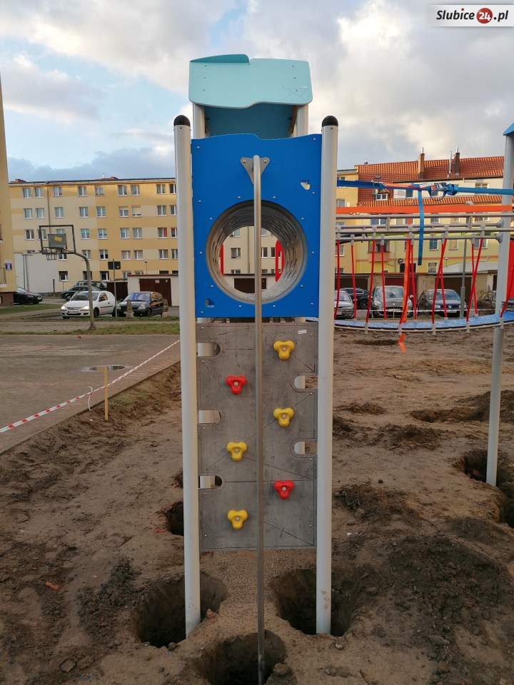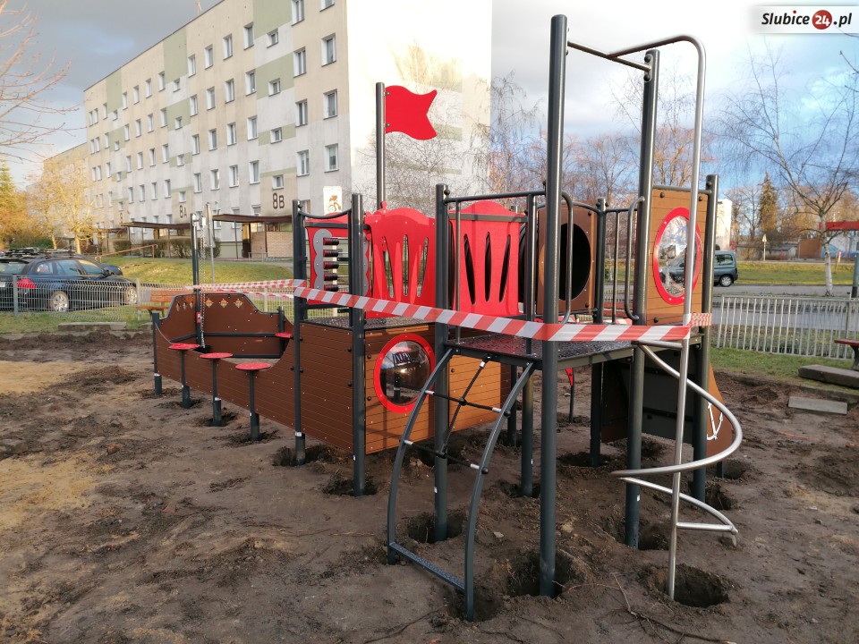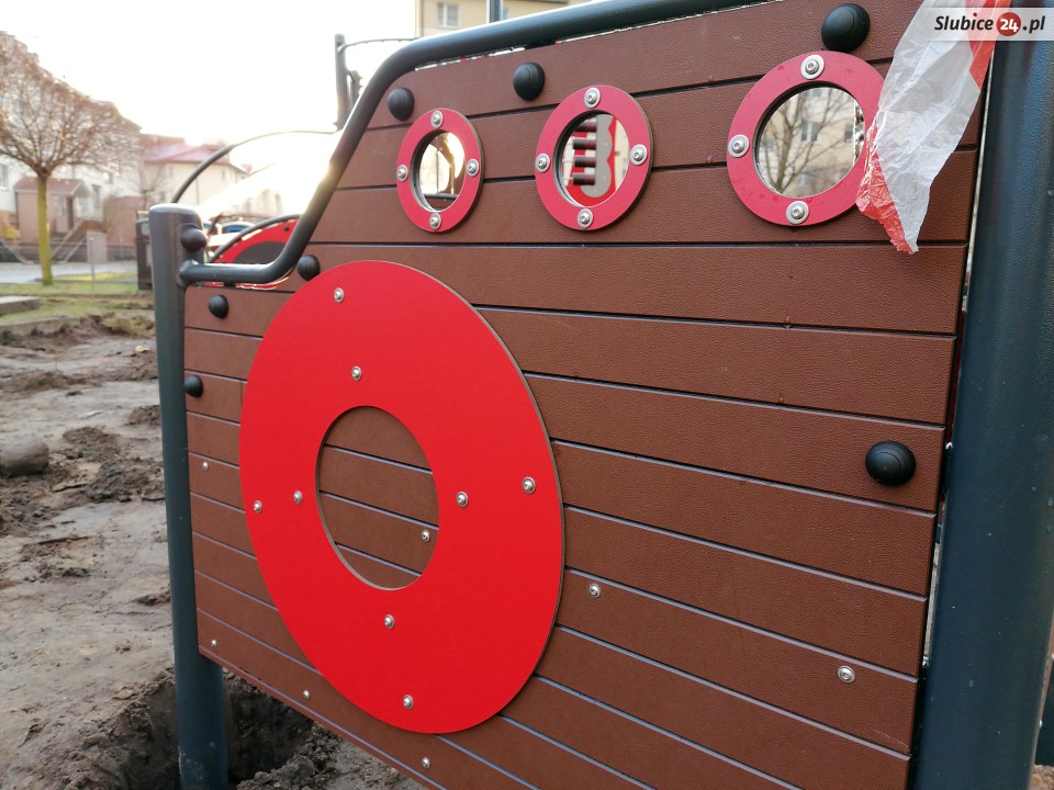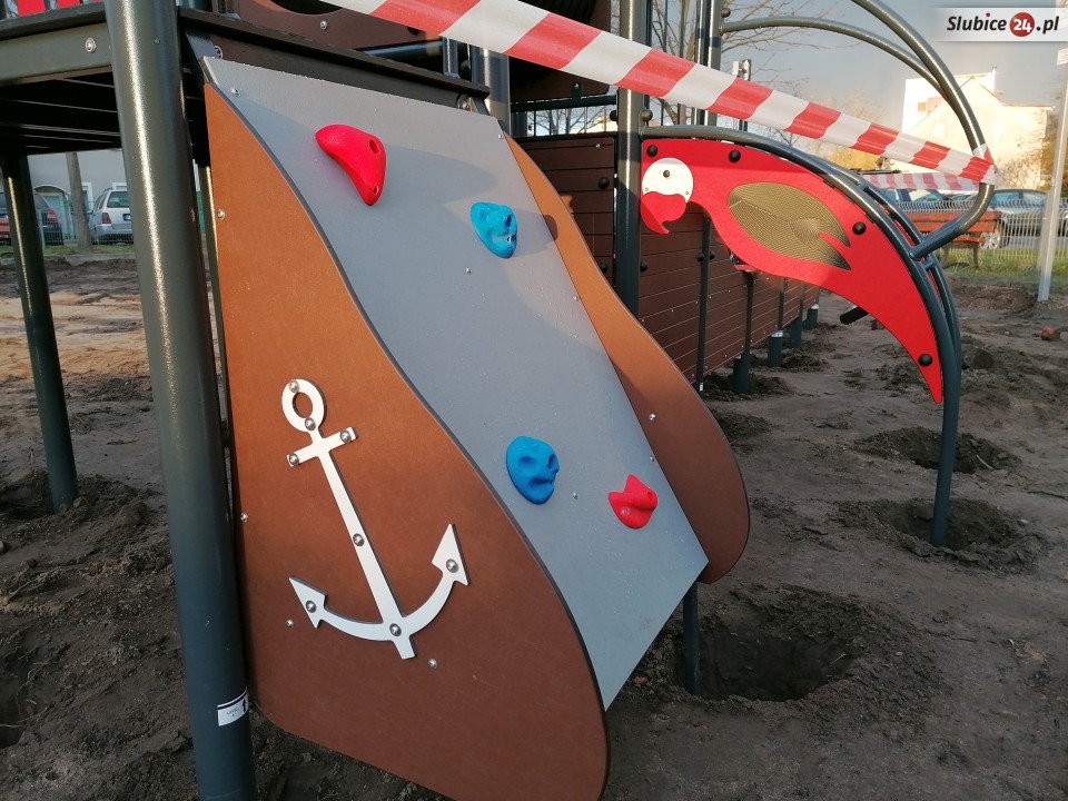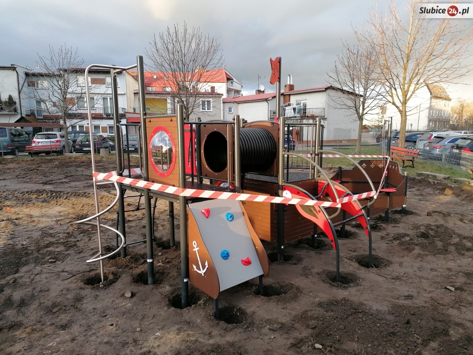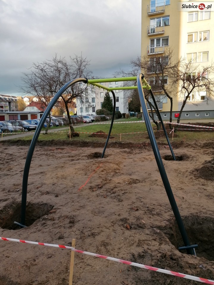 Część urządzeń jest już zainstalowanych, ale na razie jeszcze nie można na nich się bawić, ogrodzono je taśmą. W niektórych miejscach są głębokie wykopy, nie wszystko jest w pełni bezpieczne.