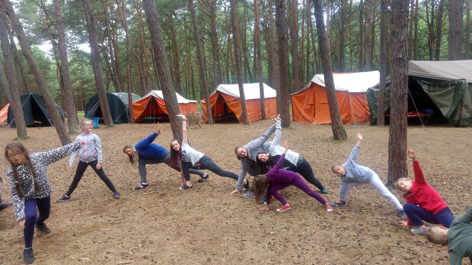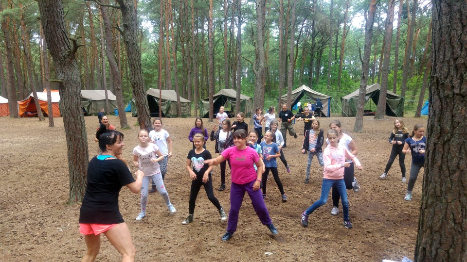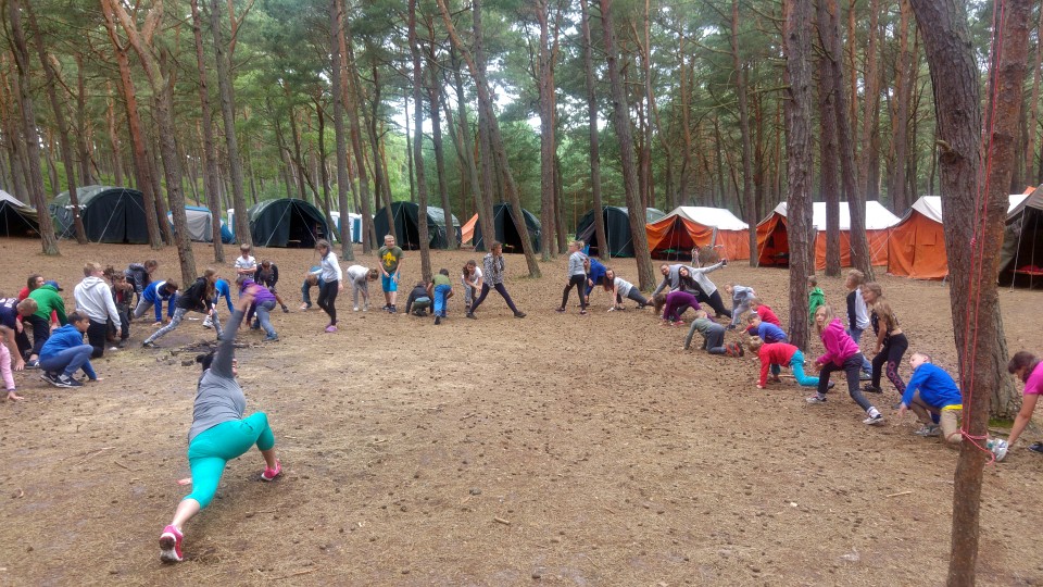 Jedną z porannych „zapraw” dla całego obozu prowadziła Alicja Pietrzak, instruktorka fitness. Oprócz gimnastyki, zaproponowała wszystkim uczestnikom trening tabata, który poprawia kondycję, zwiększa wytrzymałość i siłę.
