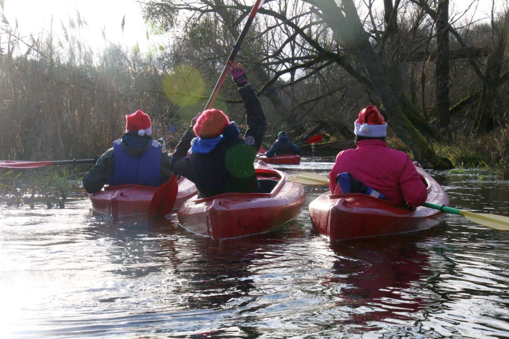 Jak na prawdziwych Mikołajów przystało, kajakarze nie zapomnieli o czerwonych czapkach z białymi pomponami i… białych brodach. W takich przebraniach weszli do kajaków i przepłynęli zaplanowany odcinek.
