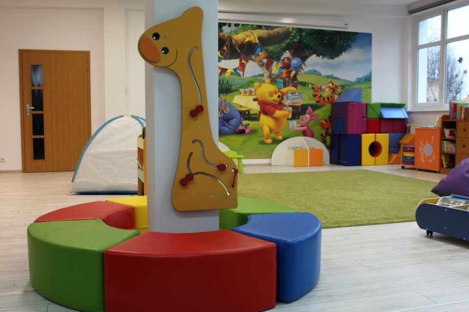 Są również nowe meble, w tym wygodne siedziska gruszki, kolorowe pufy, mobilny stojak z poduszkami, pojemniki na książki. Na filarach znalazły swoje miejsca zabawki manipulacyjne, z których chętnie korzystają najmłodsi. Wszystko doświetlają nowoczesne lampy sufitowe oraz lampy dekoracyjne nad biurkami. A na podłodze do siedzenia i zabawy zaprasza zielony puszysty dywan.