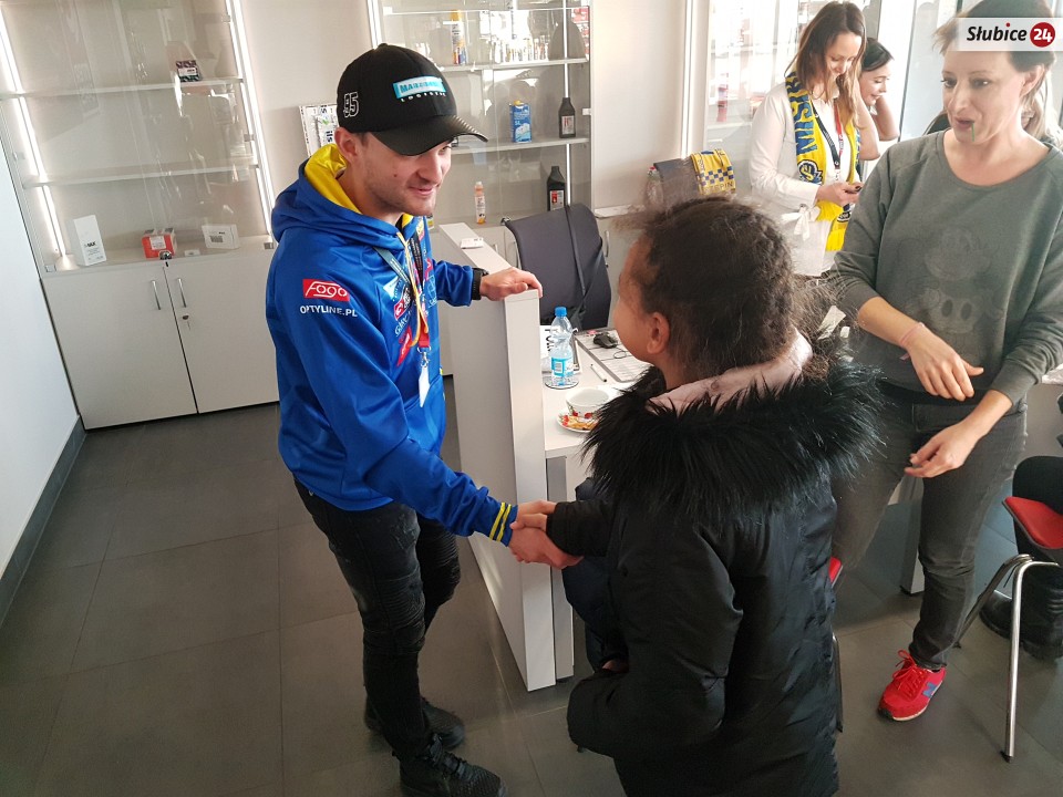 Z kolei pan Mariusz z wnuczką Natalią wiedzieli po co i dla kogo przychodzą. Wizyta w sklepie była okazją do miłej pogawędki i przywołania żużlowych wspomnień, bo dziadek kibicuje Stali już od wielu lat. I zaraził tą pasją całą rodzinę. Zawsze to oni jeżdżą do Gorzowa, a tym razem ich ulubieniec przyjechał do nich.