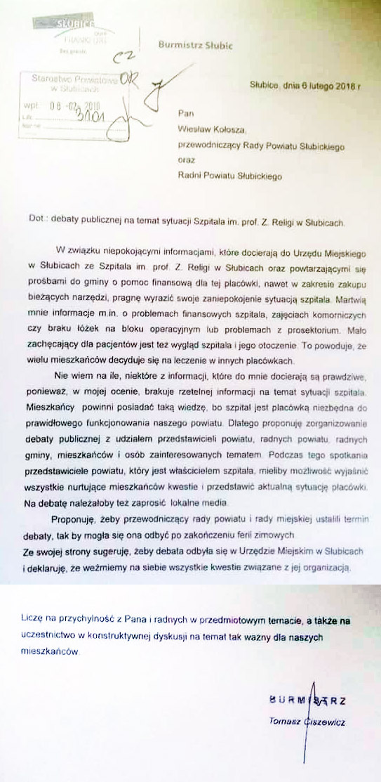 Proponuje w nim zorganizowanie debaty publicznej na temat na temat sytuacji Szpitala im. Zbigniewa Religi w Słubicach. Wyraża zaniepokojenie wiadomościami, jakie do niego docierają, w tym kierowanymi do gminy prośbami o pomoc finansową w zakresie zakupu bieżących narzędzi.
