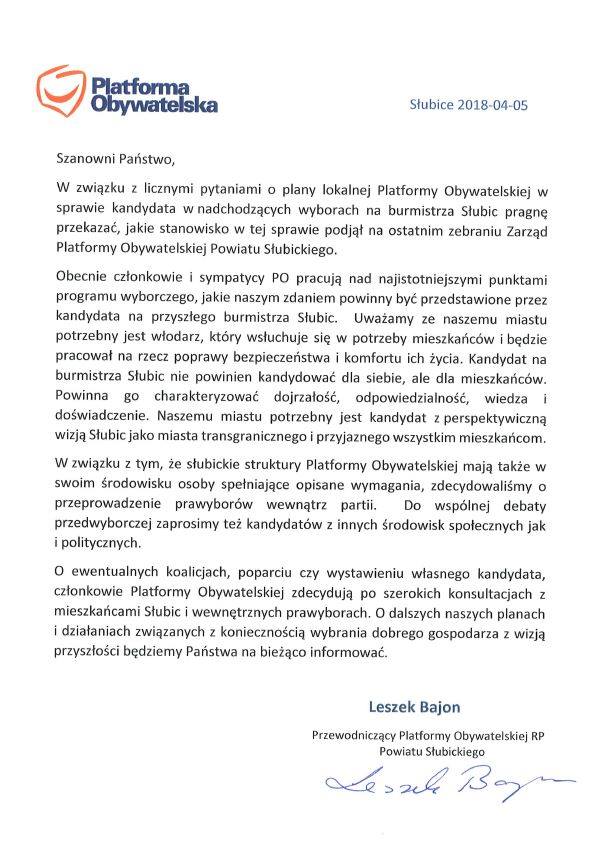 A jakie kryteria powinien spełniać kandydat platformy? - Uważamy ze naszemu miastu potrzebny jest włodarz, który wsłuchuje się w potrzeby mieszkańców i będzie pracował na rzecz poprawy bezpieczeństwa i komfortu ich życia. Kandydat na burmistrza Słubic nie powinien kandydować dla siebie, ale dla mieszkańców. Powinna go charakteryzować dojrzałość, odpowiedzialność, wiedza i doświadczenie. Naszemu miastu potrzebny jest kandydat z perspektywiczną wizją Słubic jako miasta transgranicznego i przyjaznego wszystkim mieszkańcom – czytamy w oświadczeniu zarządu PO.