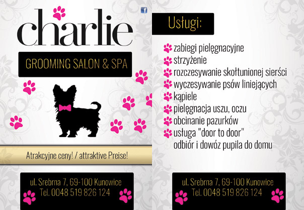 Salon Groomerski „Charlie” mieście się przy ul. Srebrnej 7 w Kunowicach. Jest czynny od poniedziałku do piątku w godzinach 9-19.