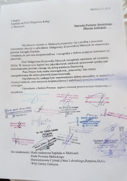 List został podpisany przez kilkanaście osób, specjalistów pracujących w Szpitalu im. prof. Zbigniewa Religi w Słubicach. Dokument jest skierowany do starosty M. Jabłońskiego, który stoi za odwołaniem M. Krasowskiej-Marczyk. Trafił także to Rady Powiatu Słubickiego, rady nadzorczej szpitala oraz włodarzy gmin z terenu powiatu. ZOBACZ LIST