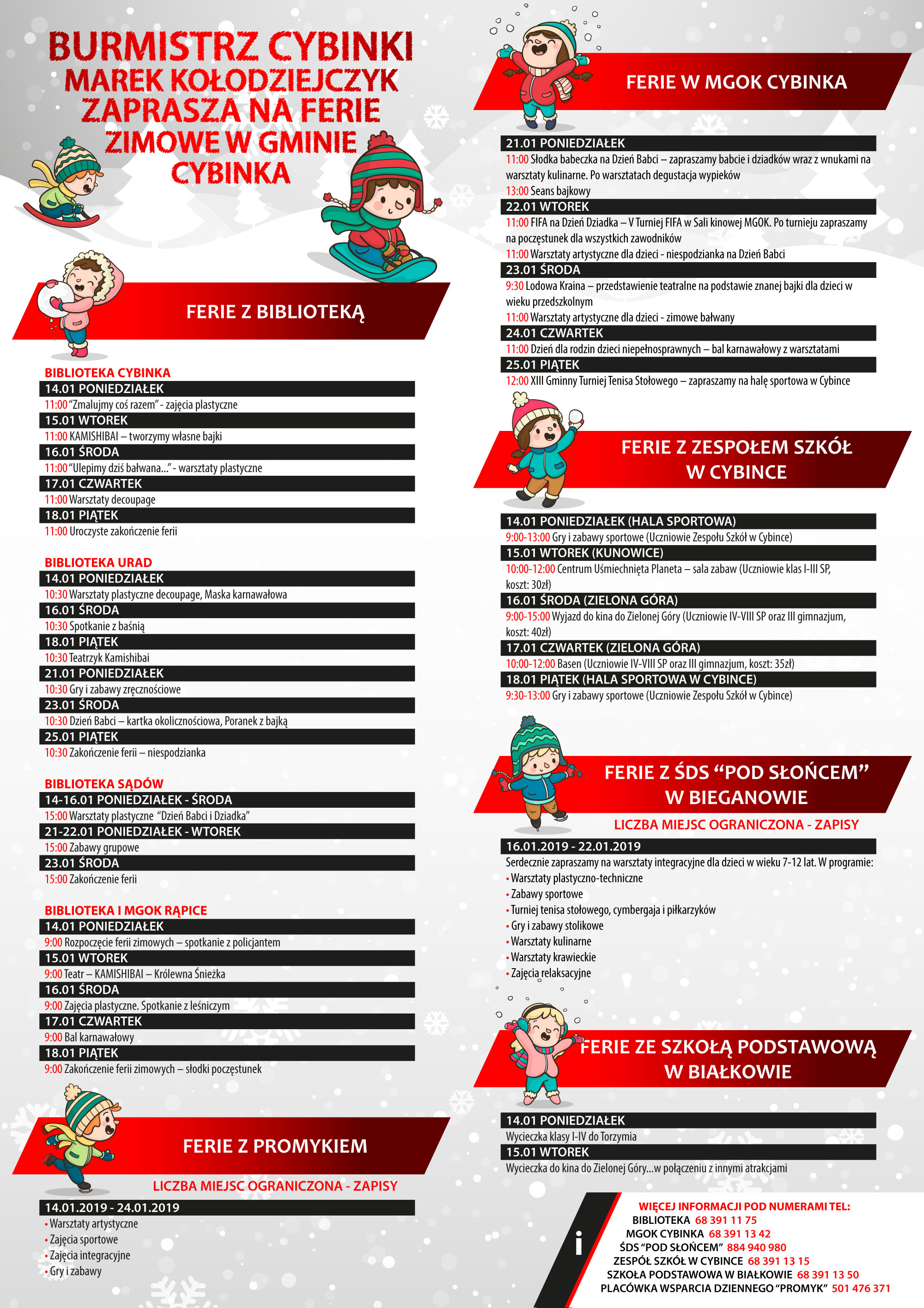 Na zajęcia w czasie zbliżających się ferii zapraszają biblioteki w Cybince, Uradzie, Rąpicach i Sądowie. Uczniowie mogą zgłosić się również na różne warsztaty i zajęcia w Placówce Wsparcia Dziennego Promyk, w Środowiskowym Domu Samopomocy w Bieganowie, czy w MGOK w Cybince.