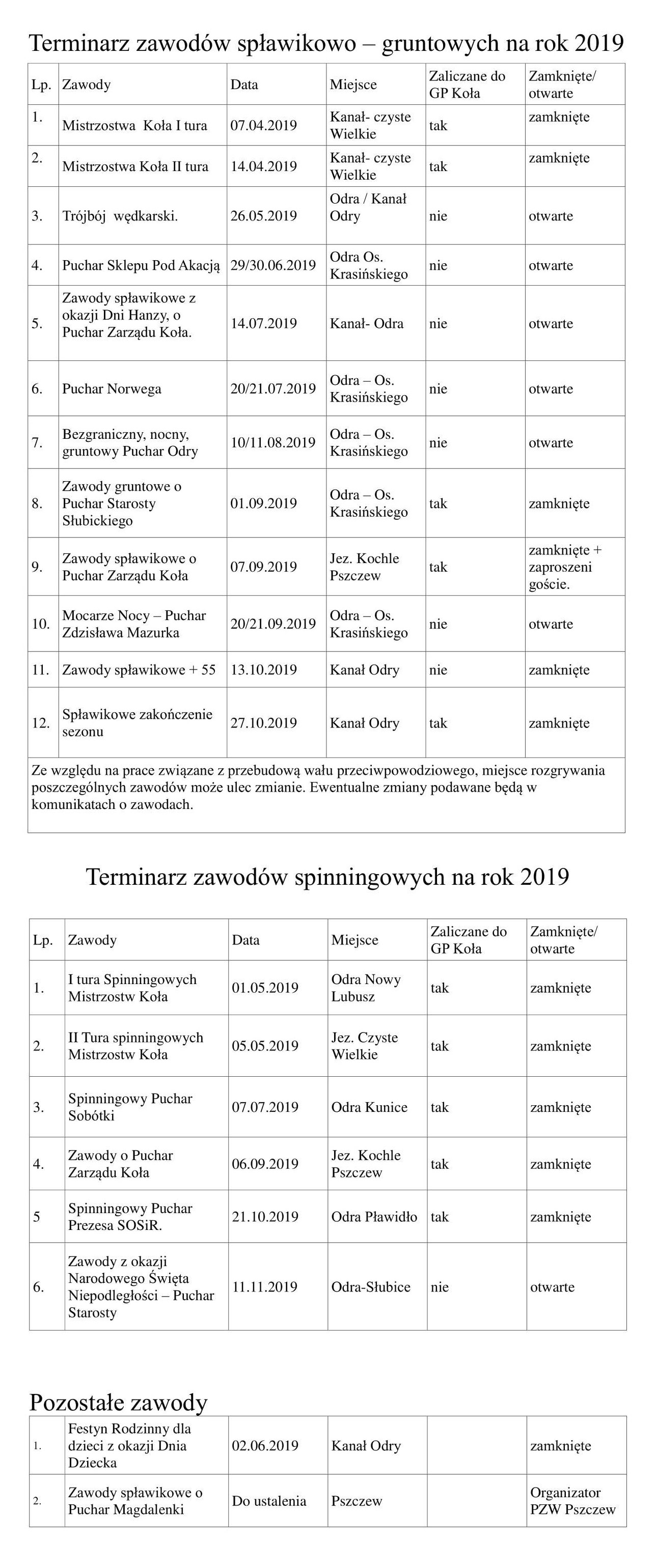KALENDARZ IMPREZ WĘDKARSKICH 2019