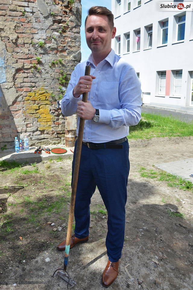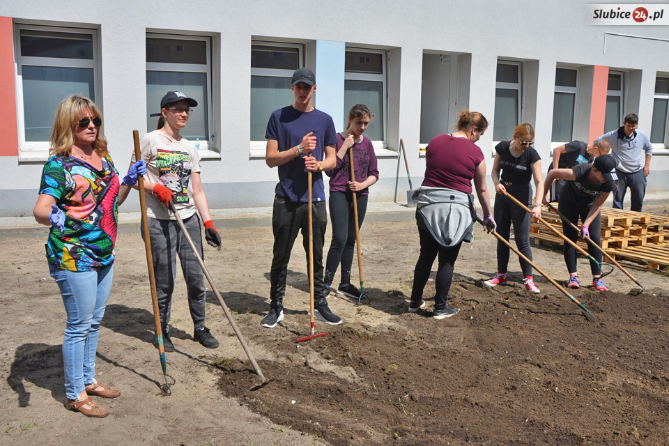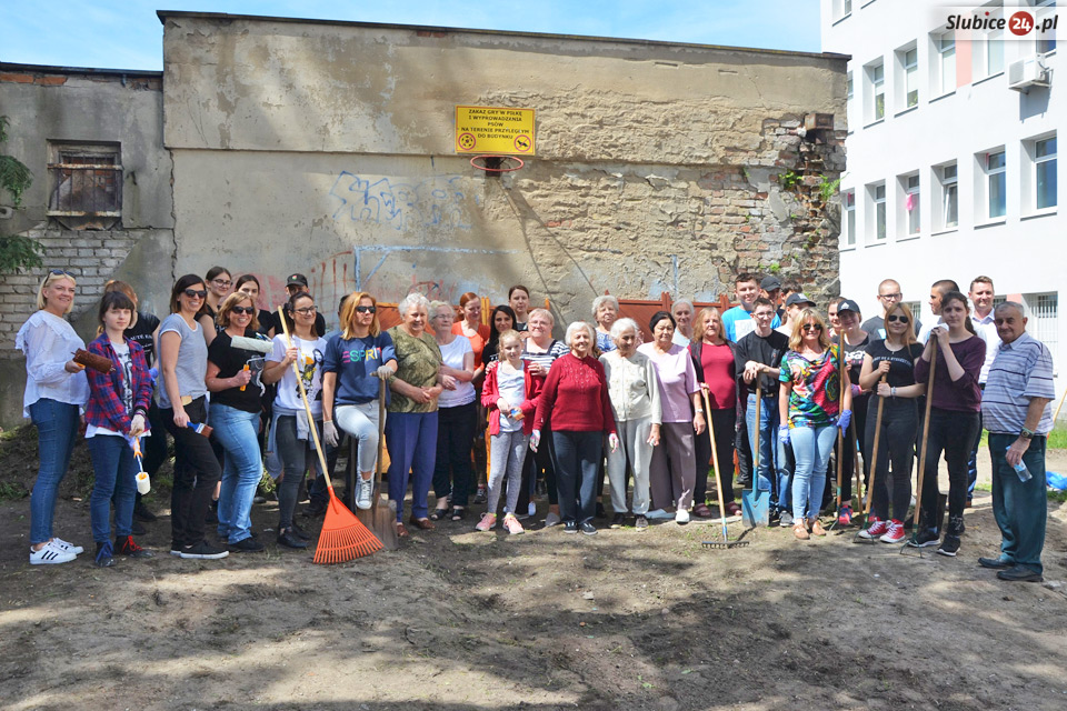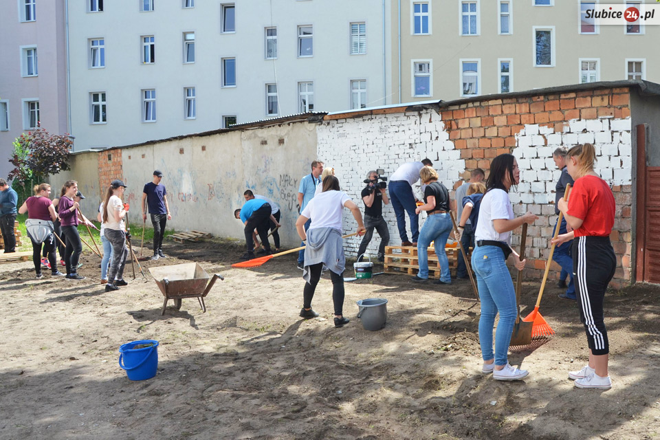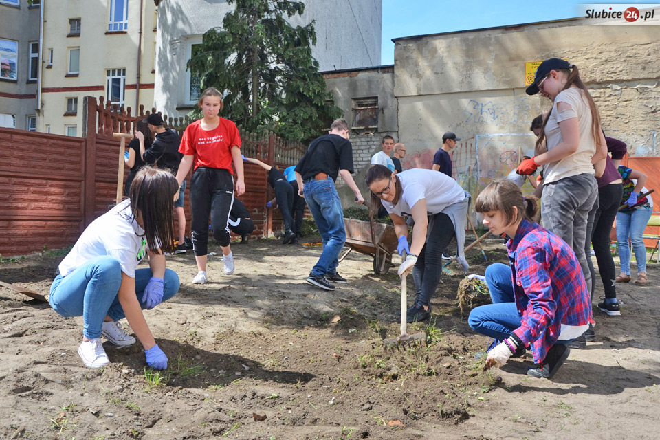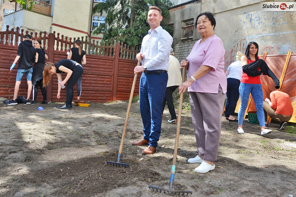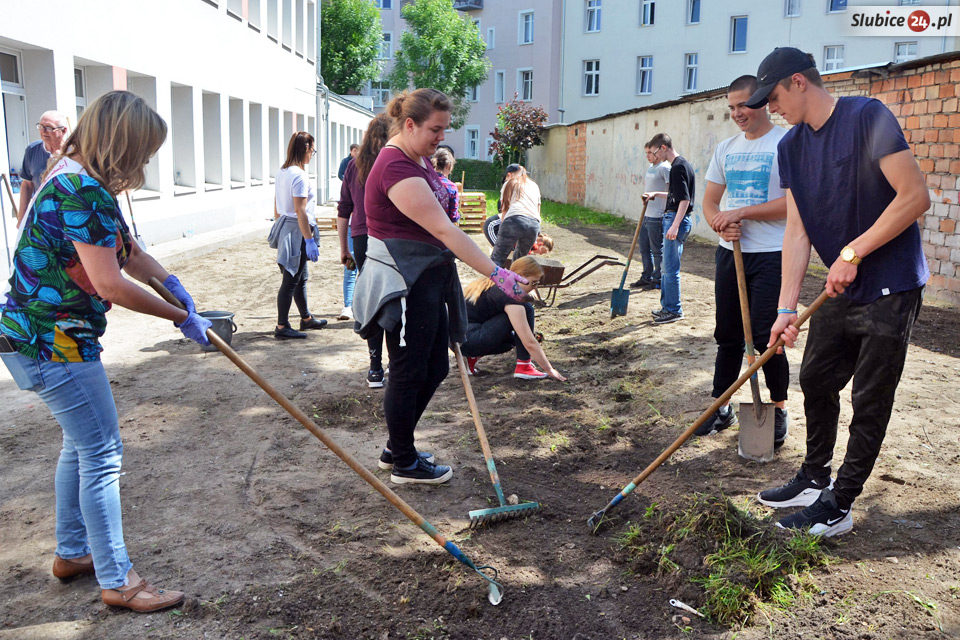 Seniorzy wyszli na teren zaniedbanego ogródka już z samego rana. Zbierali kamienie, szkło, śmieci. Kiedy zmęczeni schowali się w budynku przed słońcem, pałeczkę od nich przejęli uczniowie 1 klasy architektury krajobrazu z Centrum Kształcenia Zawodowego i Ustawicznego w Słubicach. Chwycili w dłonie grabie, łopaty, taczki!