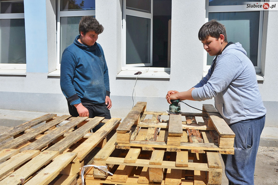 A z zebranego przy pracach gruzu powstaje skarpa, która zostanie zagospodarowana. Będzie również na czym usiąść – kilkoro uczniów szlifowało palety, z których zostaną wykonane siedziska, stół i kwietniki.