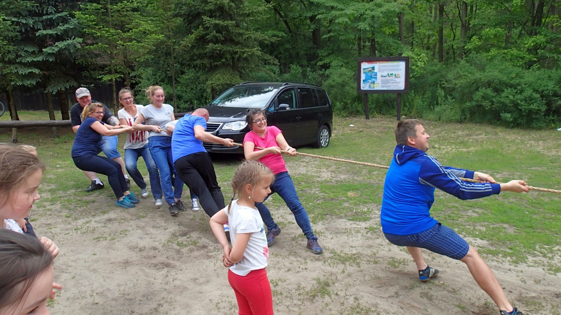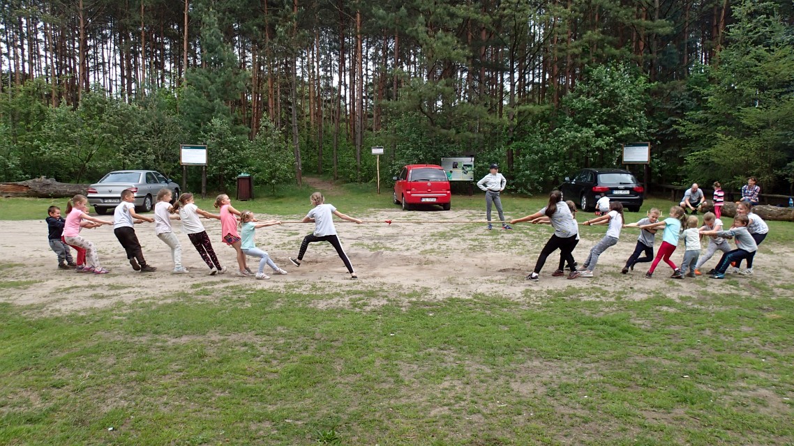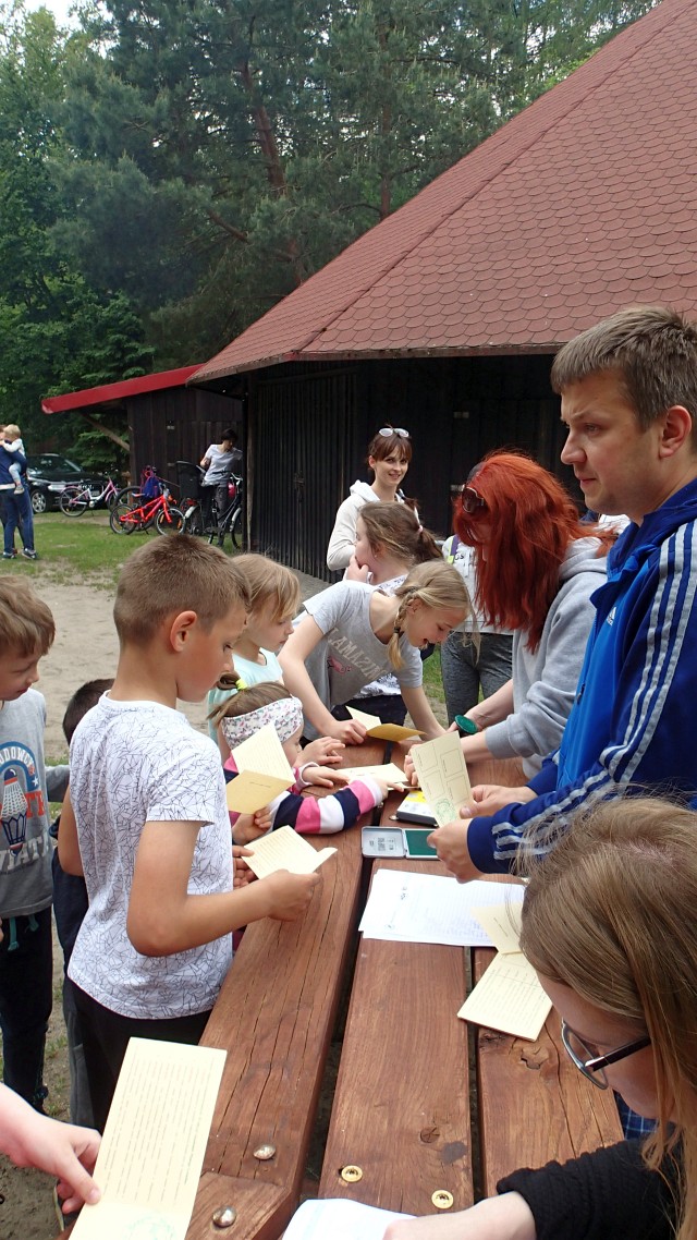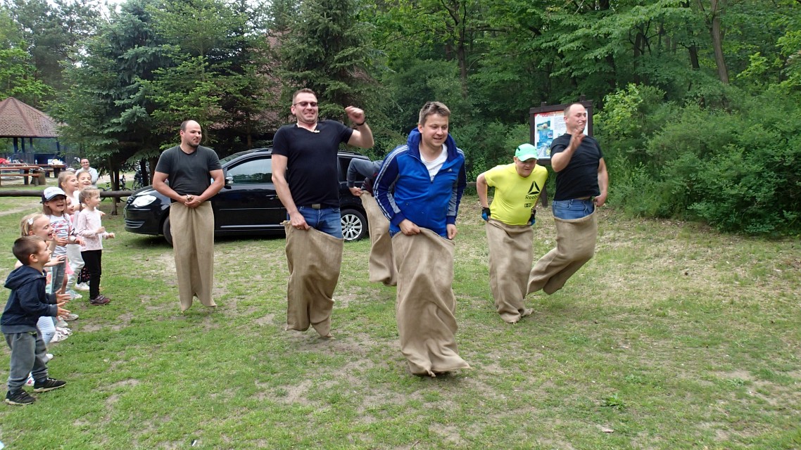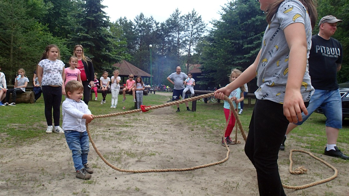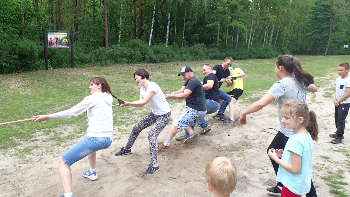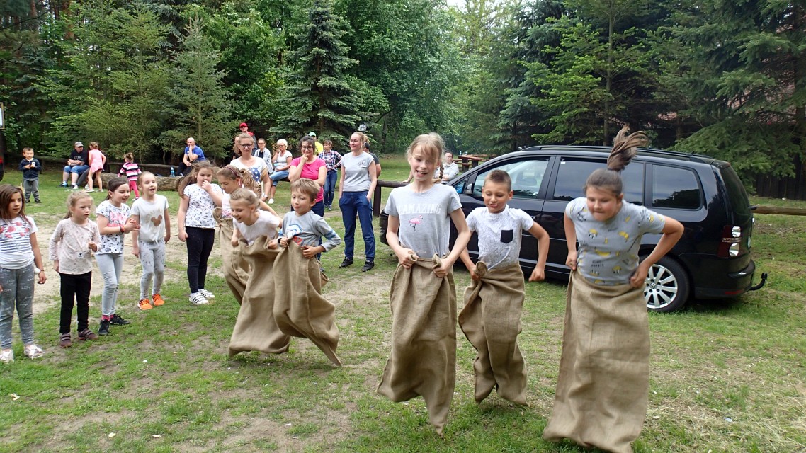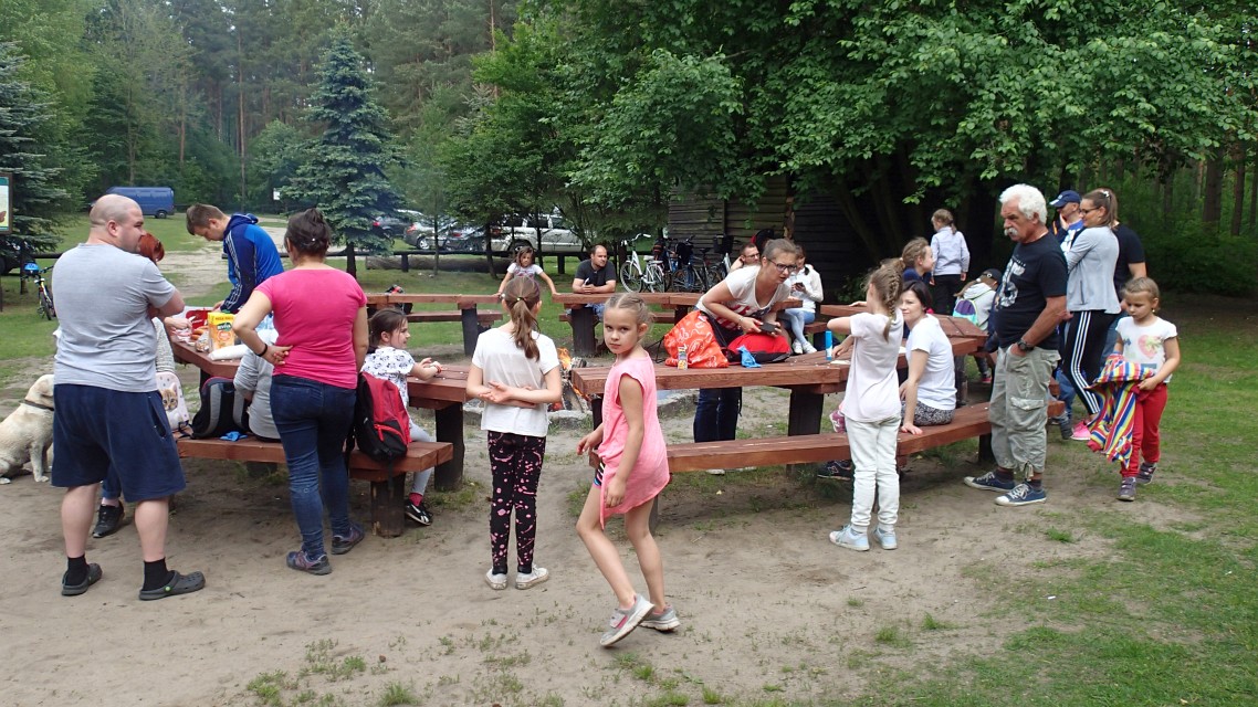 Czym byłaby taka wyprawa bez ogniska? Na zakończenie leśnej eskapady uczestnicy spotkali się w wigwamie w Nowym Młynie. Tam piekli kiełbaski i brali udział w rozmaitych zabawach, m.in. przeciąganiu liny oraz wyścigi w workach. Najmłodsi otrzymali również wpisy do swoich indeksów.