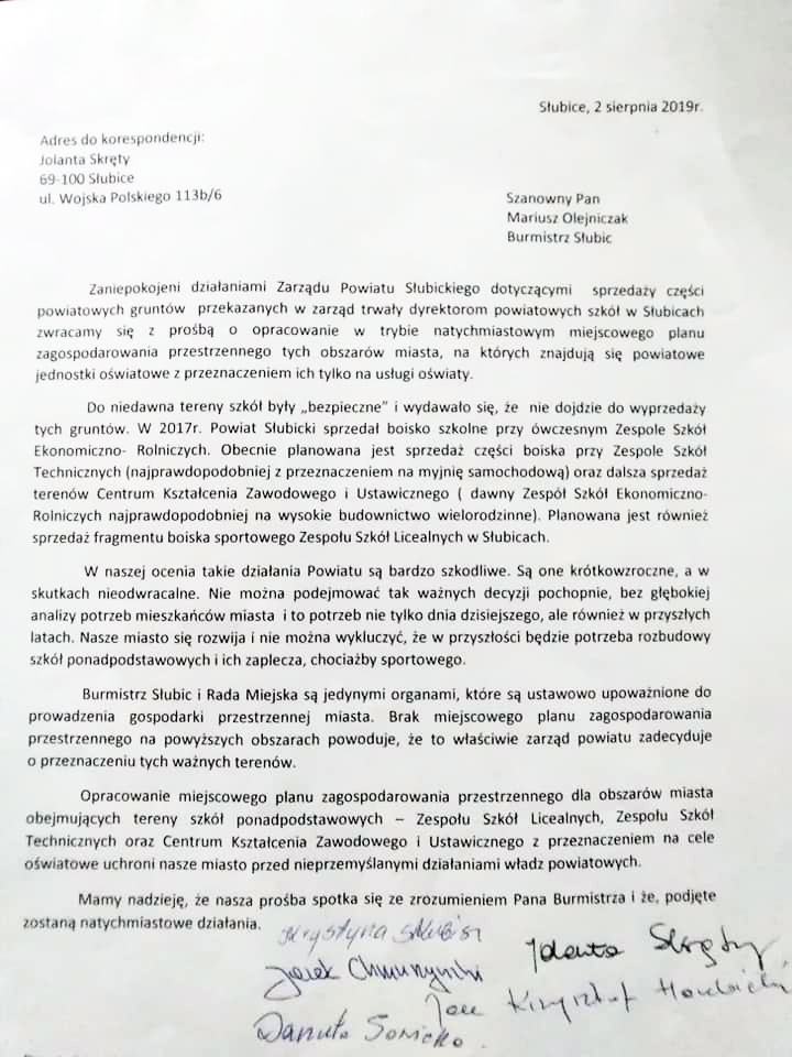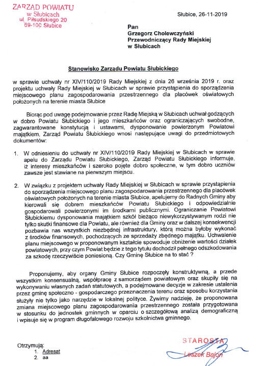 A jeszcze przed sesją, gdy było już wiadomo o planowanej uchwale, starosta Leszek Bajon wystosował list do przewodniczącego Rady Miejskiej w Słubicach, Grzegorza Cholewczyńskiego. Czytamy w nim m.in., że „ograniczenie powiatowi dysponowania majątkiem szkół rodzi nie tylko skutki finansowe, ale pozbawia nas wszystkich niezbędnej infrastruktury, którą można byłoby wykonać ze środków pochodzących ze sprzedaży tego majątku”. ZOBACZ LIST