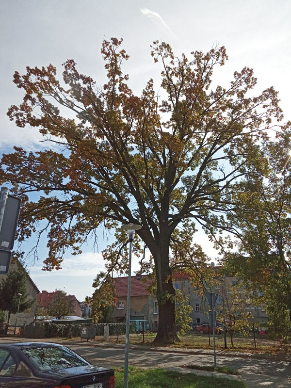 Idąc dalej, za skrzyżowaniem dochodzimy do ulicy Mieszka I, która ma być w niedługiej przyszłości remontowana. Ulica ta – jedna z bardziej zielonych w naszym mieście, jest obsadzona lipami. Przy skrzyżowaniu jest jedna martwa – trzeba usunąć. Ona nie przetrwała przycinania korony i usunięcia części korzeni podczas budowy chodnika i parkingu obok. Wszelkie remonty ulic wiążą się z wykopami, zdjęciem wierzchniej warstwy, ubiciem gruntu. Takie działania najczęściej prowadzą do ucięcia części korzeni lub ich późniejszego zamierania. W następstwie zamiera część korony, drzewo traci stabilność i pogarsza się jego ogólny stan. Odarcia kory i złamania powodowane przez ciężki sprzęt również nie pozostają bez wpływu.