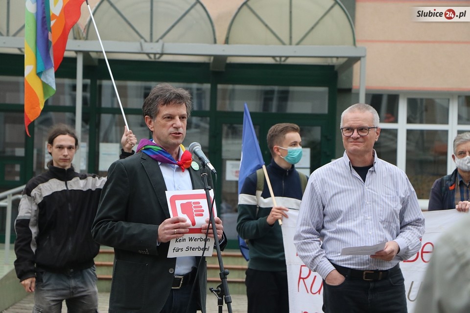Marsz Pokoju ruszył z parku am Anger we Frankfurcie, przeszedł przez graniczny most i zatrzymał się pod słubicką biblioteką. Tu doszło do incydentu z udziałem mężczyzny, który zaczął wykrzykiwać w stronę zebranych agresywne hasła. – Bandyci, macie krew na rękach – wołał. Został zatrzymany przez policjantów.