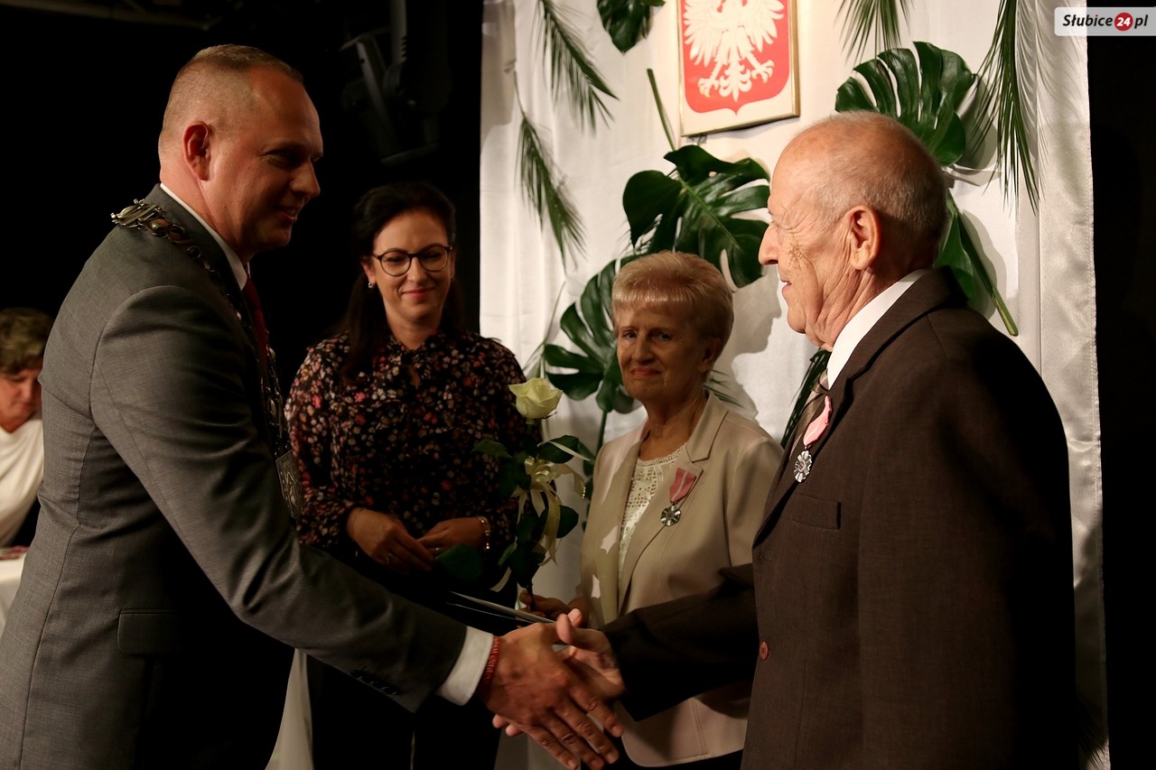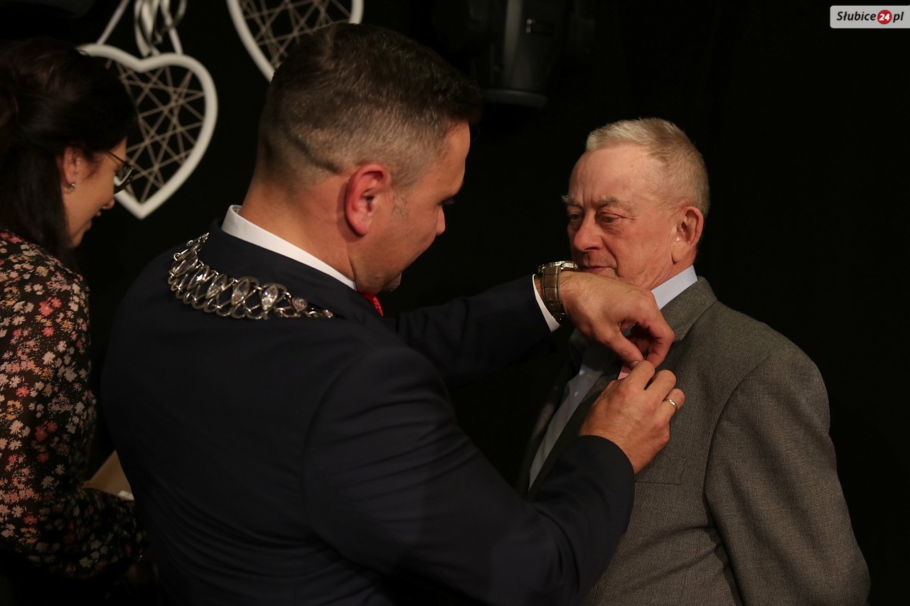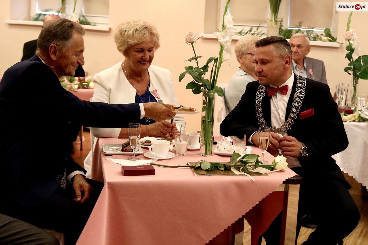 Jubilatom wręczył Medale za Długoletnie Pożycie Małżeńskie przyznane przez prezydenta Polski Andrzeja Dudę. To odznaczenie państwowe dla osób, które w jednym związku małżeńskim przeżyły co najmniej 50 lat. Burmistrzowi towarzyszyli jego zastępczyni Adriana Dydyną-Marycką oraz szef rady miejskiej Grzegorz Cholewczyński, a całość poprowadziła Małgorzata Pasternak.