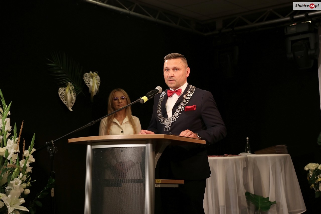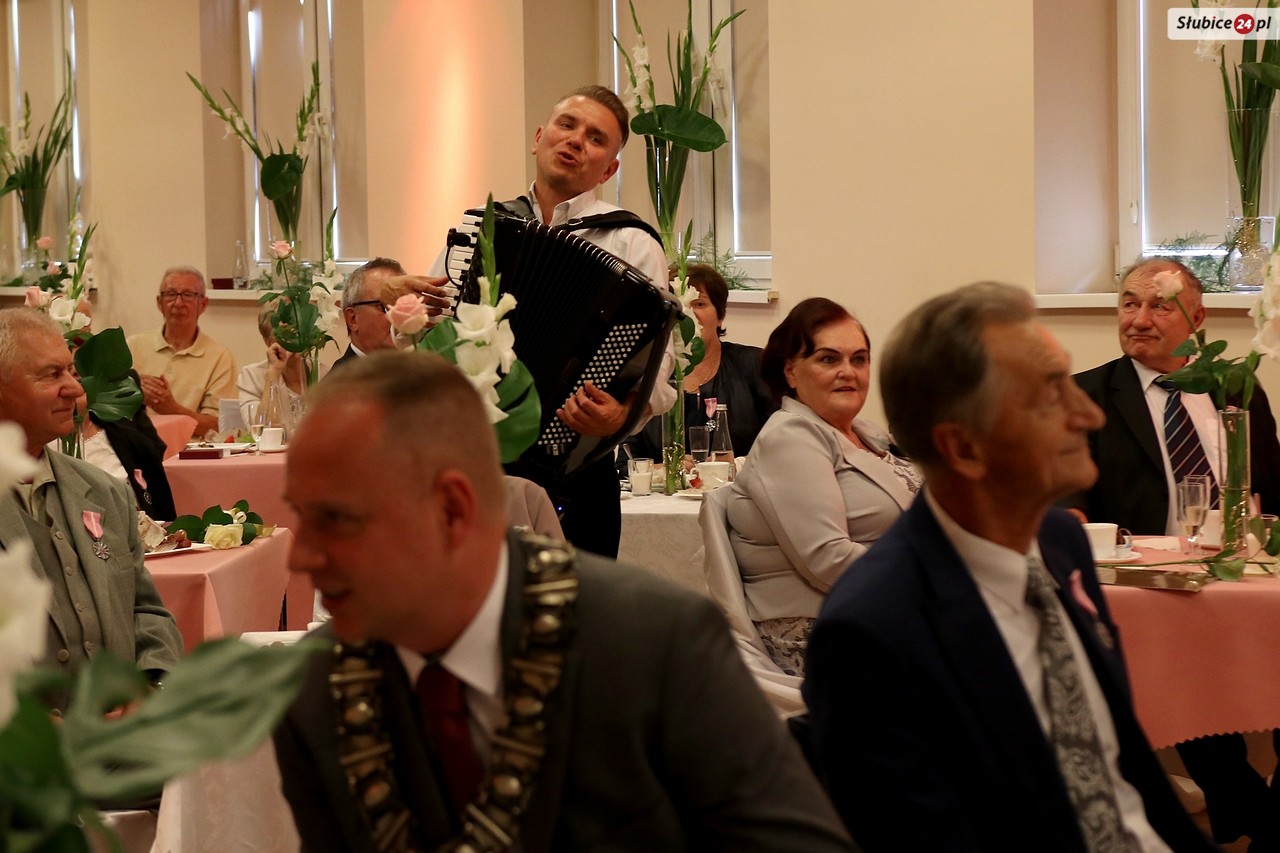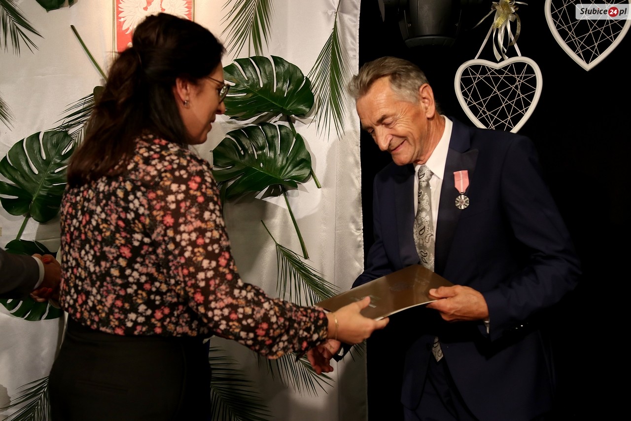 Jubilatom wręczył Medale za Długoletnie Pożycie Małżeńskie przyznane przez prezydenta Polski Andrzeja Dudę. To odznaczenie państwowe dla osób, które w jednym związku małżeńskim przeżyły co najmniej 50 lat. Burmistrzowi towarzyszyli jego zastępczyni Adriana Dydyną-Marycką oraz szef rady miejskiej Grzegorz Cholewczyński, a całość poprowadziła Małgorzata Pasternak.