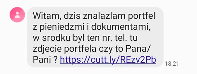 - Witam, dzis znalazlam portfel z pieniedzmi i dokumentami, w srodku był ten nr. tel. tu zdjecie portfela, czy to Pana/Pani? – smsa tej treści (pisownia oryginalna) z dołączonym linkiem, w który trzeba było wejść, żeby zobaczyć zdjęcie, dostała jedna z naszych czytelniczek.