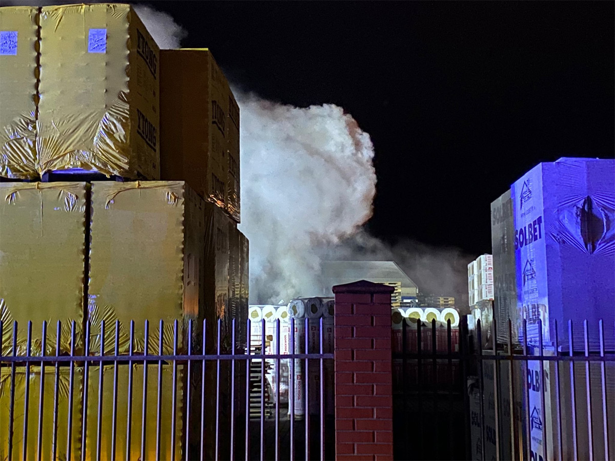 Na terenie składu pracują wózki widłowe, którymi pracownicy próbują przenieść towar w bezpieczne miejsce i nie dopuścić do rozprzestrzeniania się ognia.