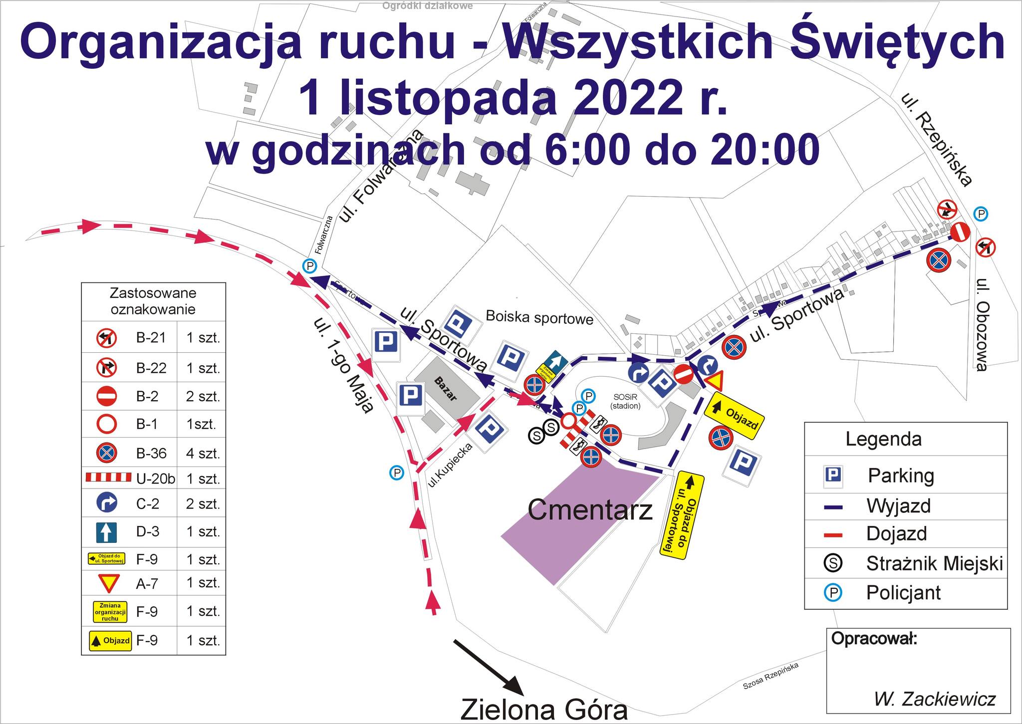 1 listopada dojazd do parkingów położonych wokół cmentarza i bazaru będzie odbywać się ul. 1 Maja i ul. Kupiecką, a wyjazd ul. Sportową, a dalej ulicami Rzepińską, Obozową i Folwarczną. Fragment ul. Sportowej, na odcinku od drogi brukowej na cmentarz do skrzyżowania z ul. Obozową i Rzepińską, będzie ulicą jednokierunkową.