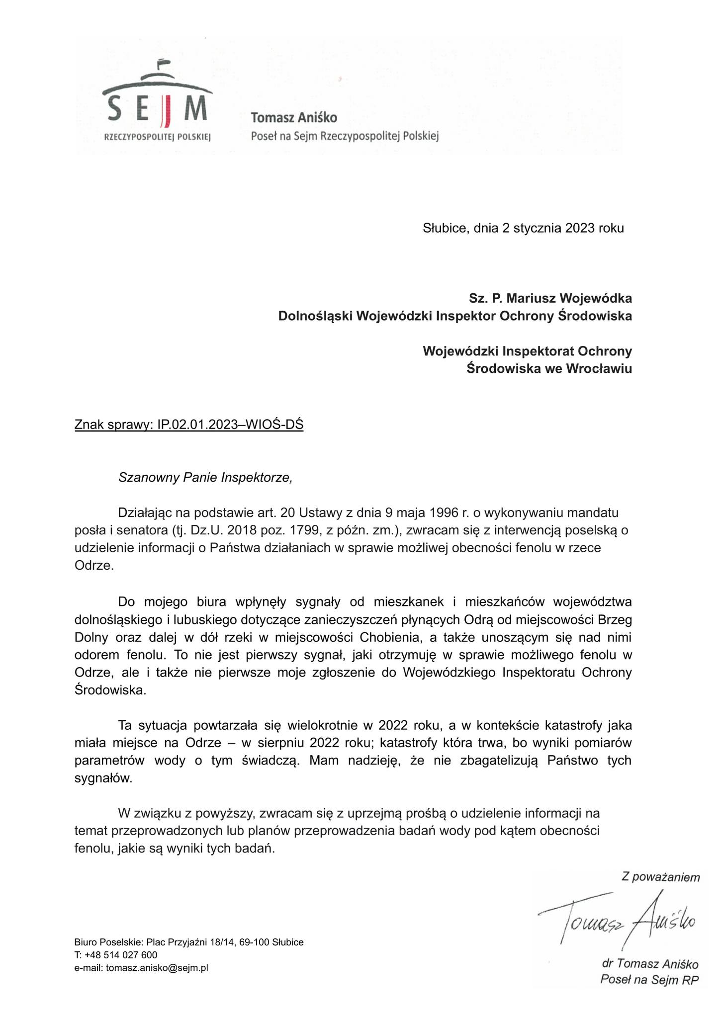 Nowy rok zaczynamy niestety od katastrofy na Odrze... Do mojego biura wpłynęło dzisiaj zgłoszenie dotyczące możliwości zatrucia Odry fenolem. Intensywny zapach czuć na odcinku rzeki poniżej Brzegu Dolnego. Dlatego wspólnie z moją asystentką społeczną, Ewą Drewniak skierowaliśmy interwencję poselską do Wojewódzkiego Inspektoratu Ochrony Środowiska we Wrocławiu.