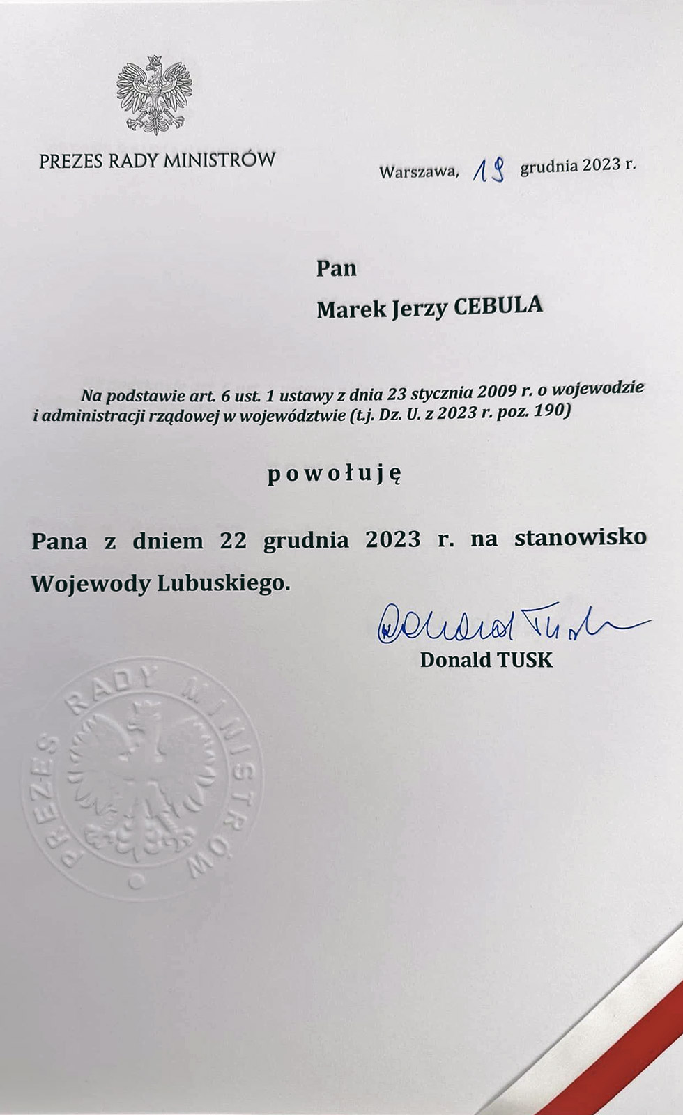 - To dla mnie ogromny zaszczyt - dziękuję i zapewniam, że będę wojewodą wszystkich Lubuszan. Jestem człowiekiem dialogu, co udowodniłem przez dwie dekady mojej pracy na rzecz społeczeństwa. Do zobaczenia na spotkaniach – napisał na swojej stronie internetowej M. Cebula.