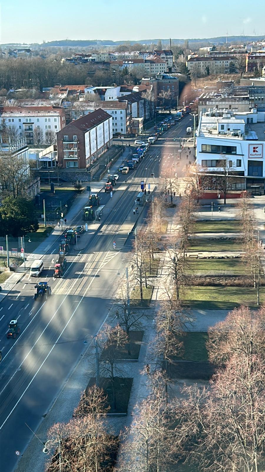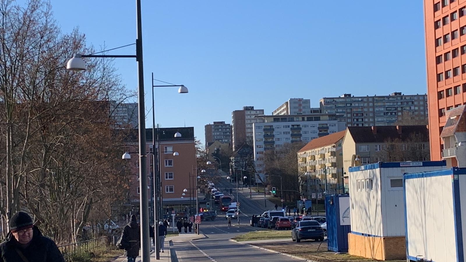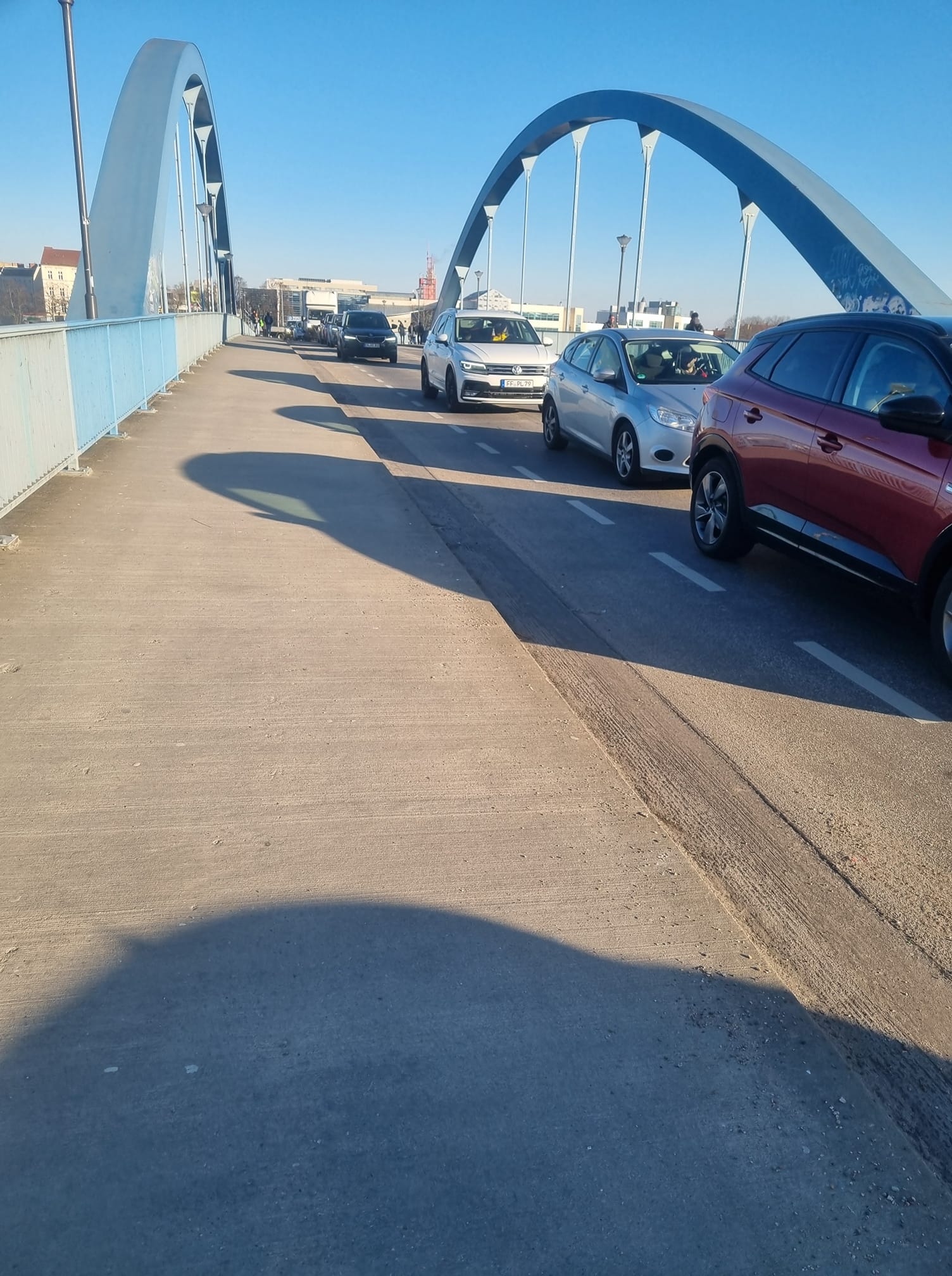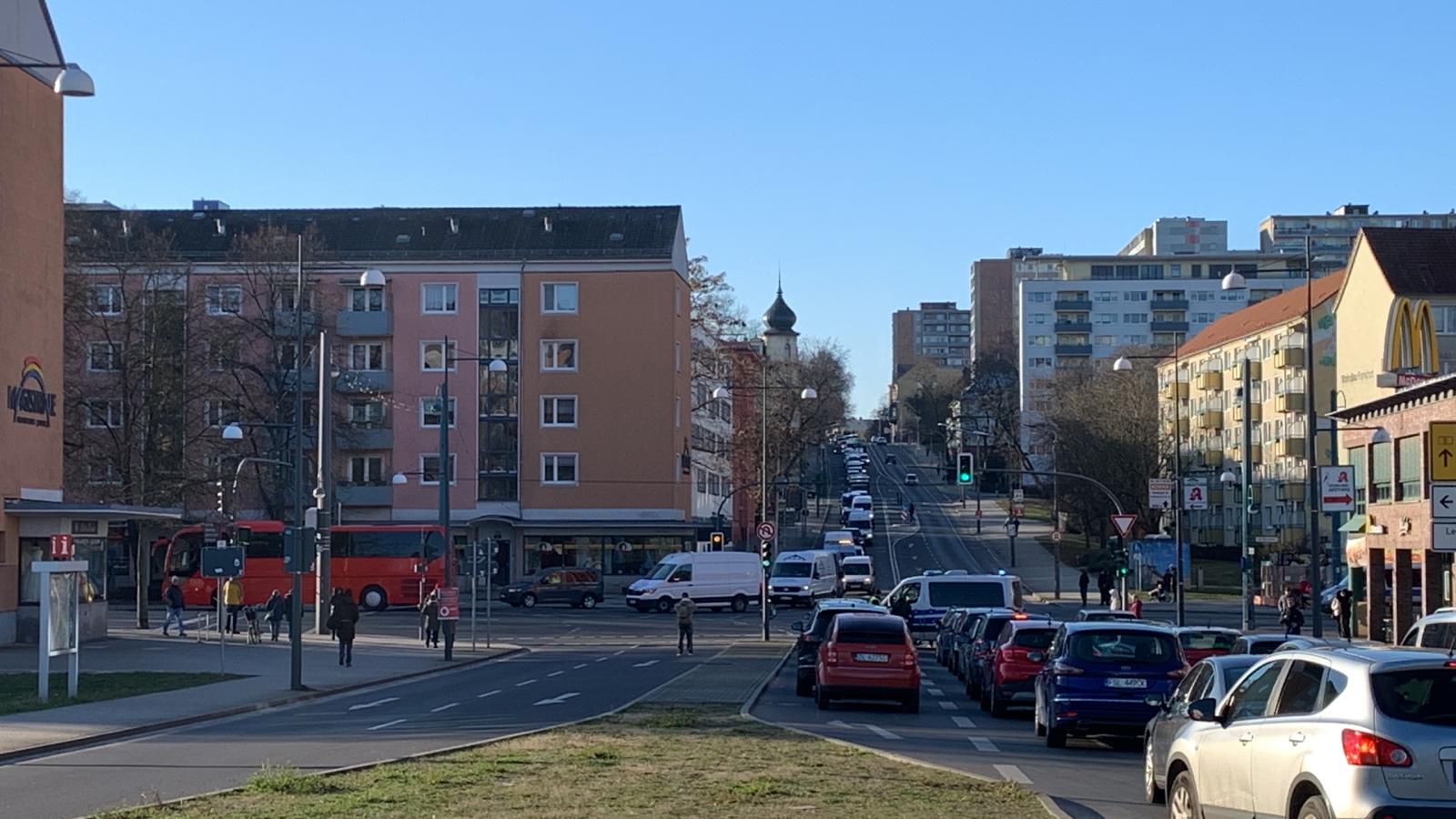 Na nagraniach przesłanych przez naszego czytelnika widać sznur pojazdów jadących powoli główną arterią komunikacyjną Frankfurtu (Karl-Marx-Straße), która krzyżuje się z drogą prowadzącą od polsko-niemieckiej granicy (Slubicer Straße).