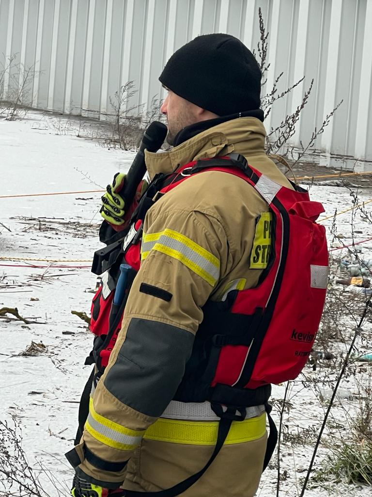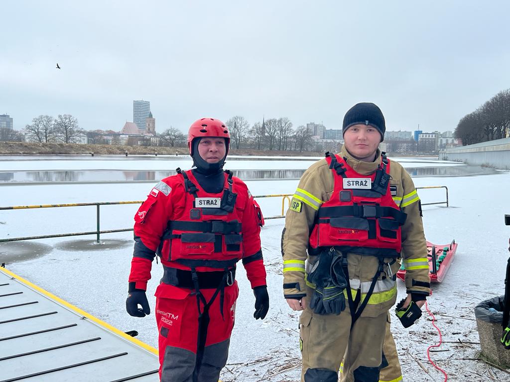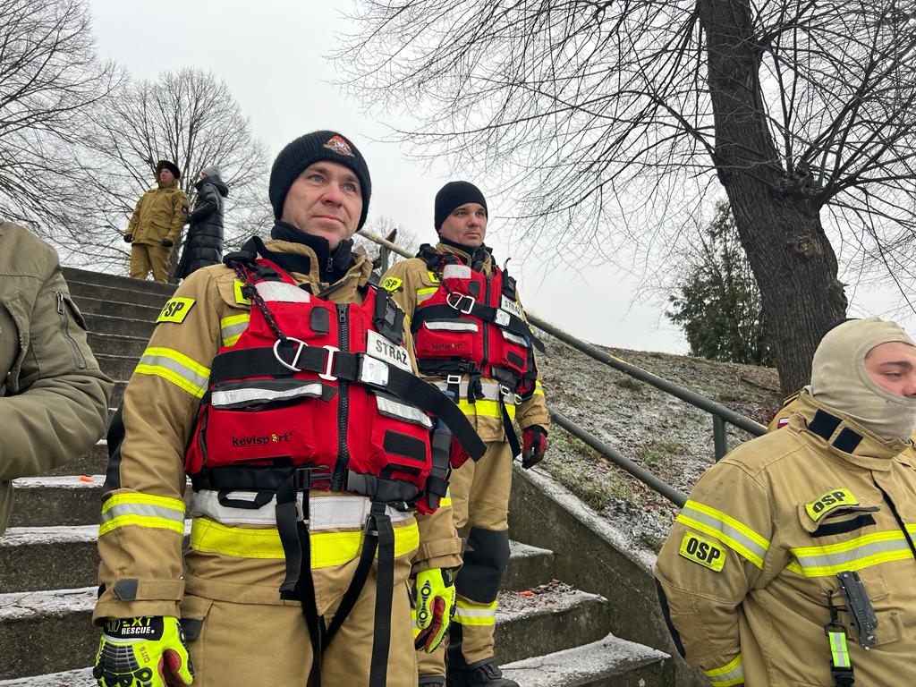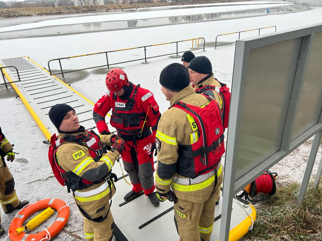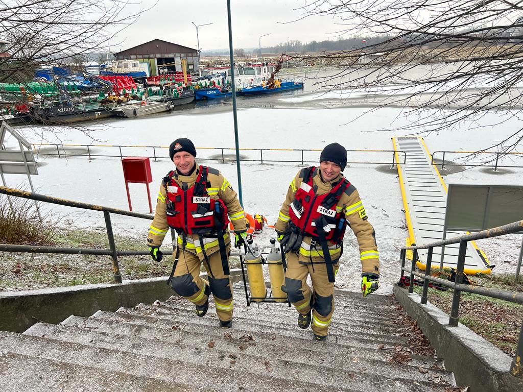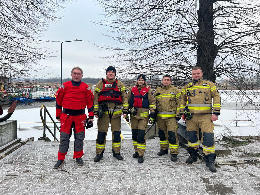 Zawodowi strażacy zaprosili do ćwiczeń swoich kolegów z Ochotniczej Straży Pożarnej w Słubicach. Wszystko działo się 12 stycznia na terenie portu rzecznego w kanale Odry.