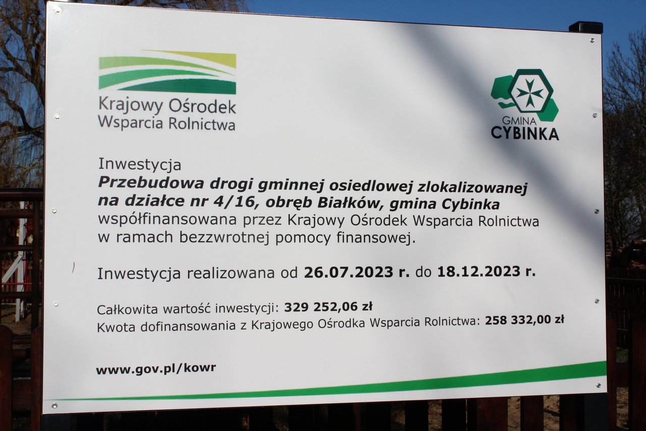 W Białkowie zakończyła się przebudowa drogi gminnej położonej na działce nr 4/16, którą Agencja Rynku Rolnego (obecny KOWR) przekazała Gminie Cybinka w 2004 r. nieodpłatnie, choć w złym stanie technicznym. Jak podaje Gmina Cybinka, przeprowadzono wiele rozmów na temat remontu tej trasy, dlatego koniec inwestycji cieszy tym bardziej.
