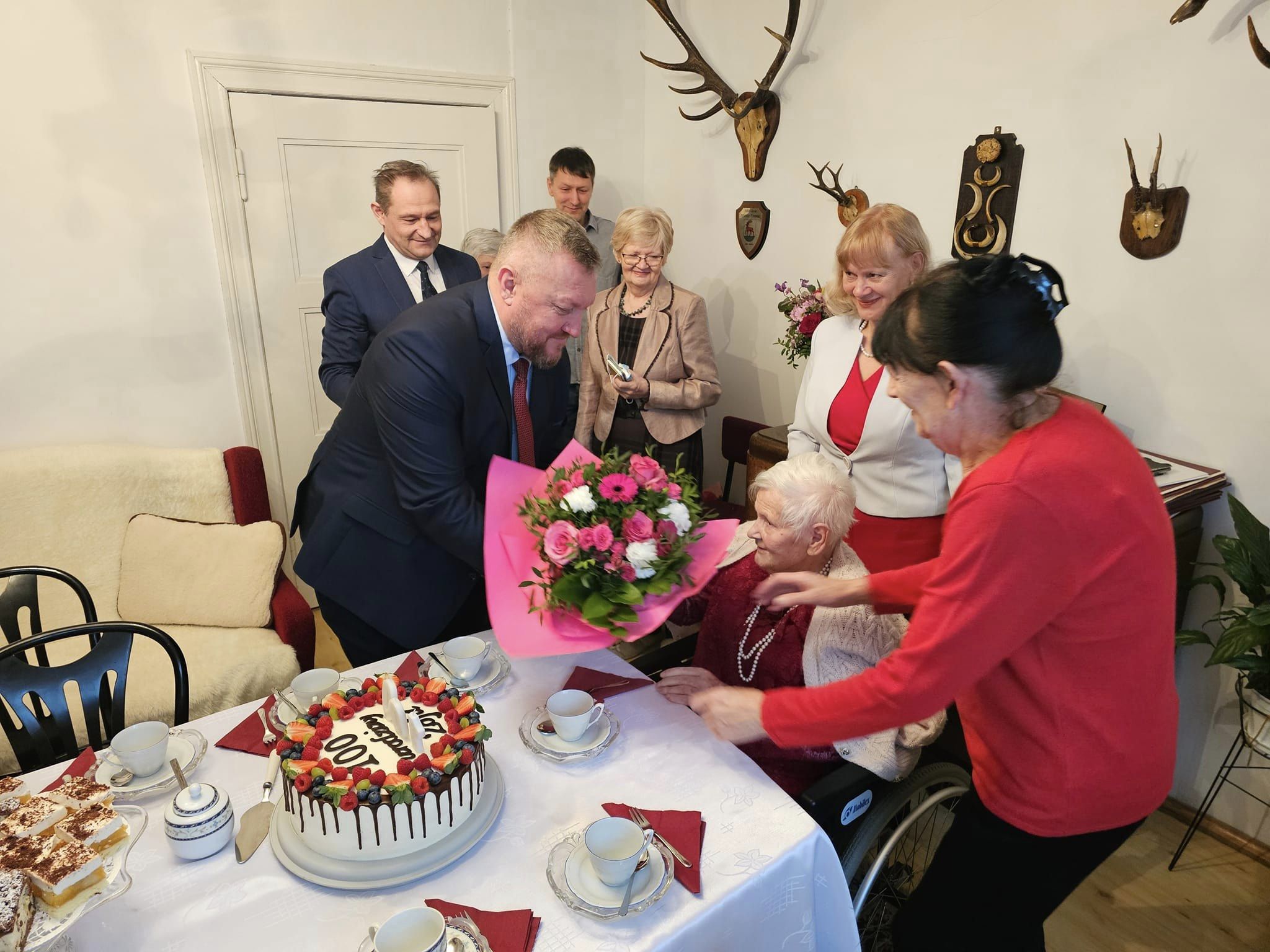 Z rąk burmistrza Sławomira Dudzisa oraz przewodniczącego Rady Miejskiej Dariusza Wąsowicza solenizantka otrzymała list gratulacyjny, bukiet kwiatów i kosz upominkowy.