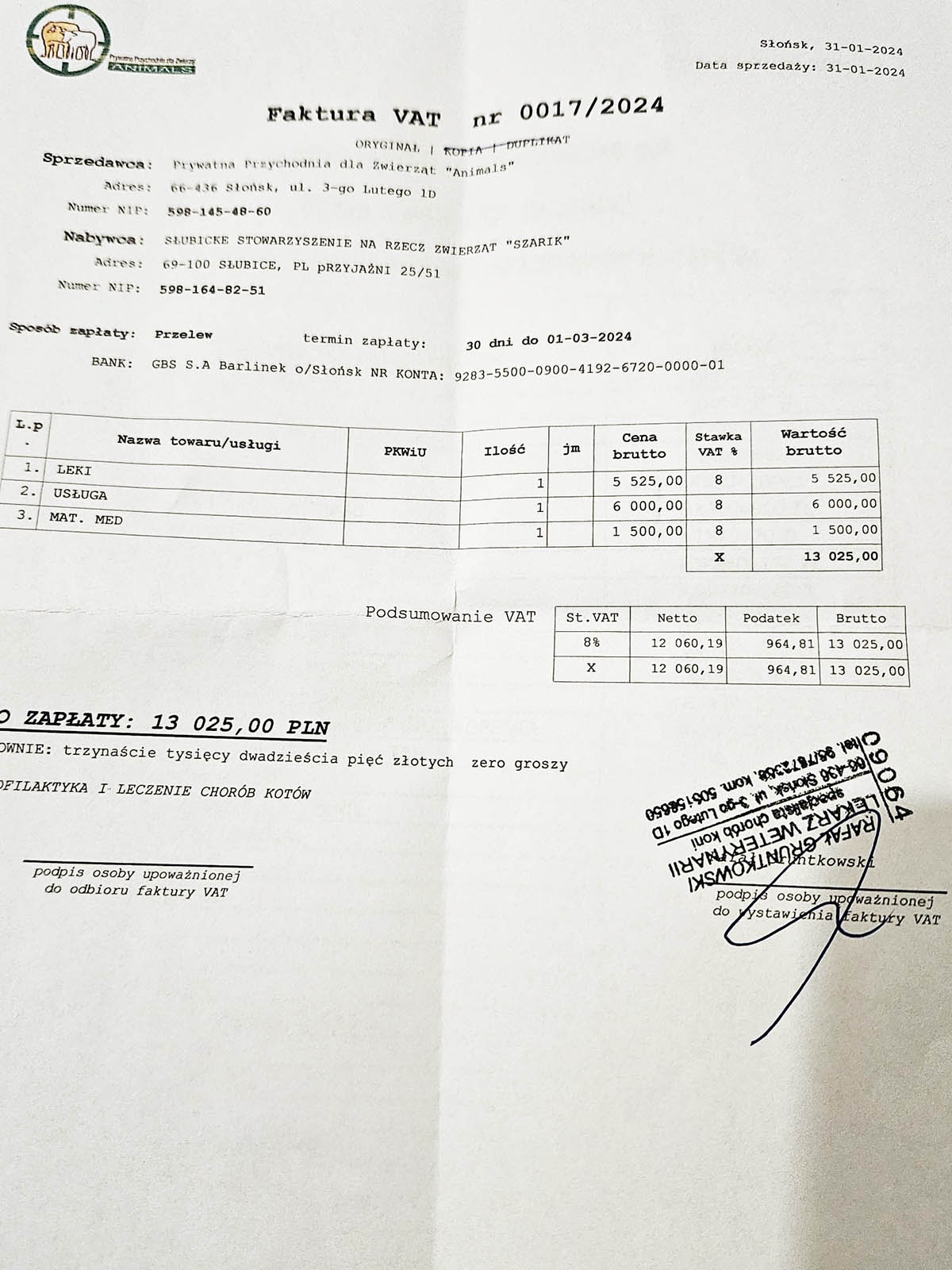 12 lutego przedstawiciele Szarika poinformowali o fakturze na kwotę ponad 13 tys. zł, jaką otrzymali od jednego z gabinetów weterynaryjnych za leczenie kilkudziesięciu kotów. - Szkoda, że za pomaganie trzeba płacić. Dobrze, że nasi weterynarze liczą tak tanio – czytamy na stronie.
