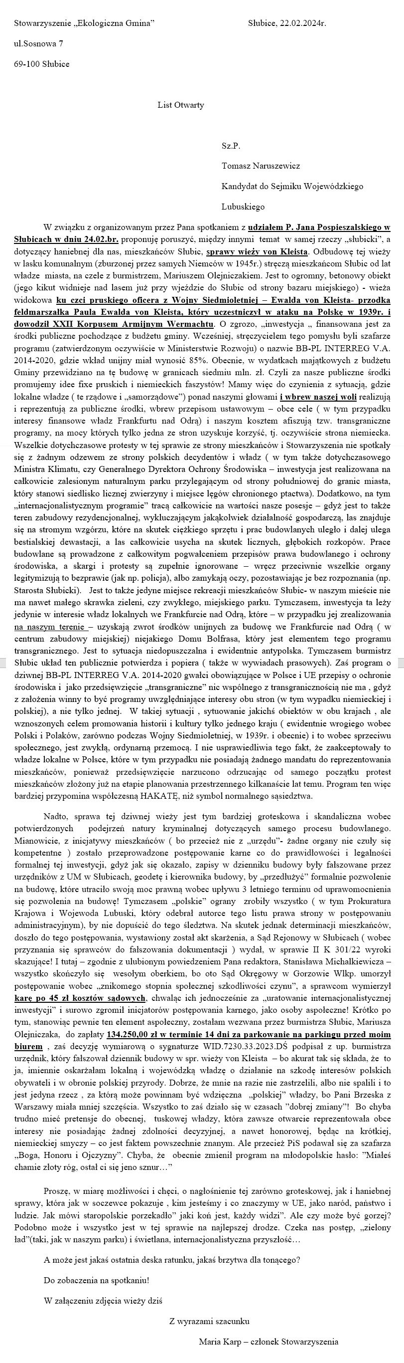 Maria Karp ze Stowarzyszenia „Ekologiczna Gmina” przesłała do naszej redakcji list w sprawie budowy wieży Kleista. List ma charakter otwarty, ale jest skierowany do jednego z polityków kandydujących w nadchodzących wyborach samorządowych – Tomasza Naruszewicza.