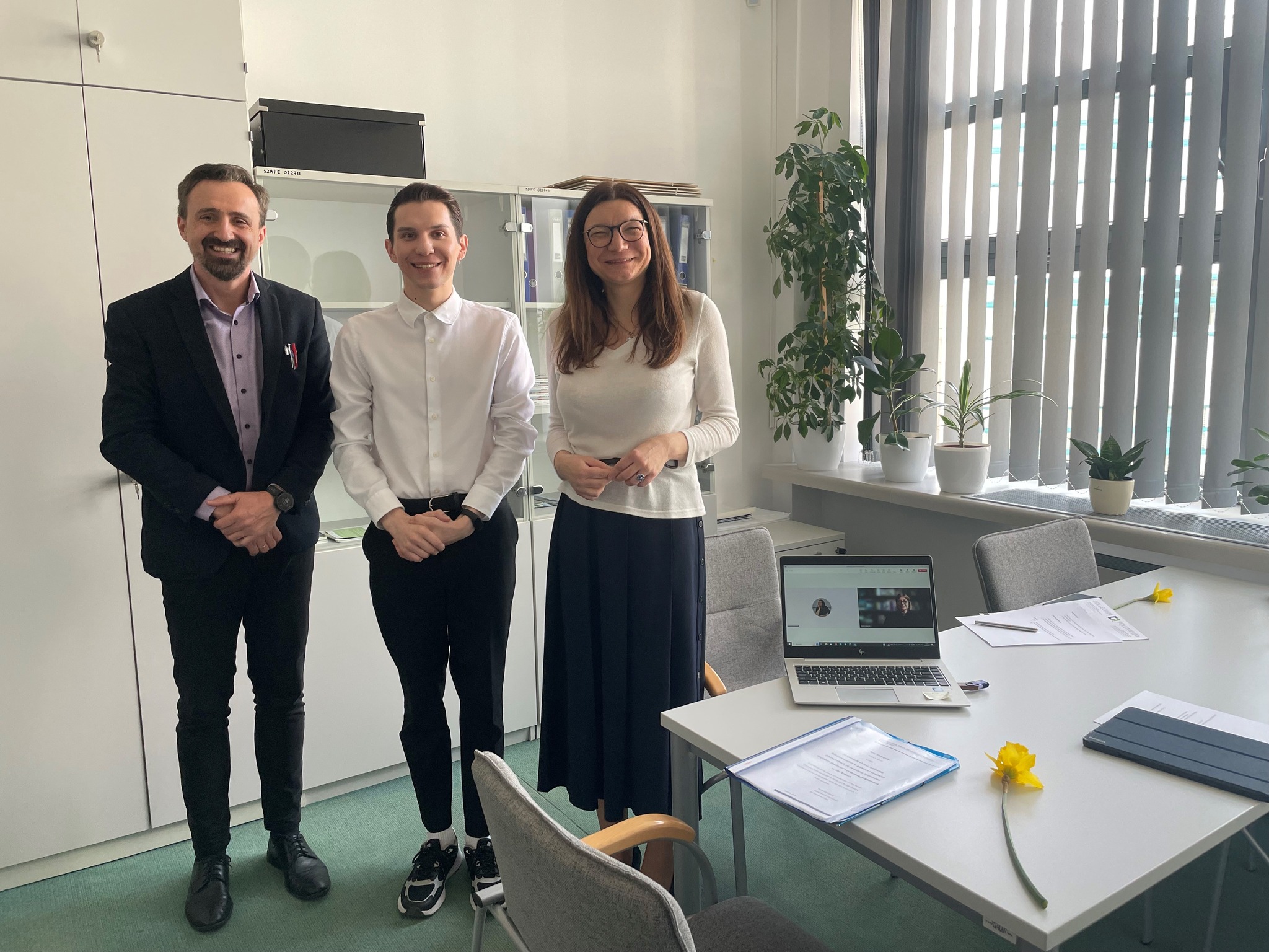 Na zdjęciu, wykonanym tuż po obronie pracy, znajdują się świeżo upieczony absolwent wraz ze swoim promotorem oraz prof. Justyna Krauze-Pierz, pełnomocniczka rektora UAM ds. dydaktyki w CP.