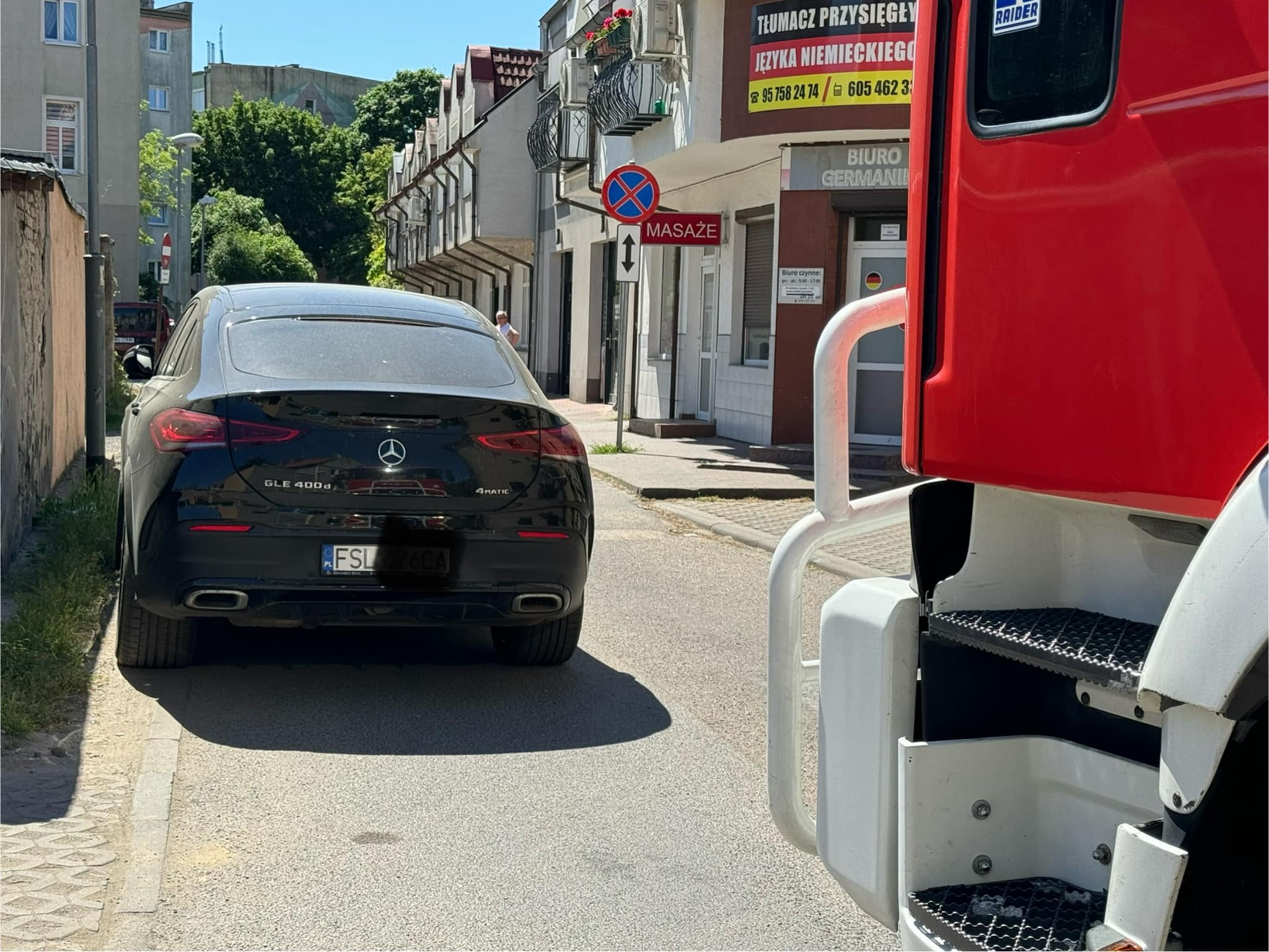Niestety mamy kolejny przykład bezmyślnego parkowania, dodatkowo w miejscu zakazanym, przez co ani nasz, ani inny pojazd pożarniczy nie miałby możliwości przejazdu.