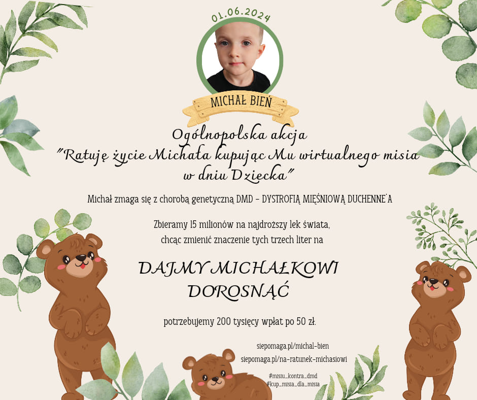 Przed nami kolejna akcja pomocy na rzecz Michałka Bienia. Tym razem wolontariusze zachęcają do kupna wirtualnego misia z okazji Dnia Dziecka, czyli wpłaty w wysokości 50 zł na konto pomocowe chorego chłopca.