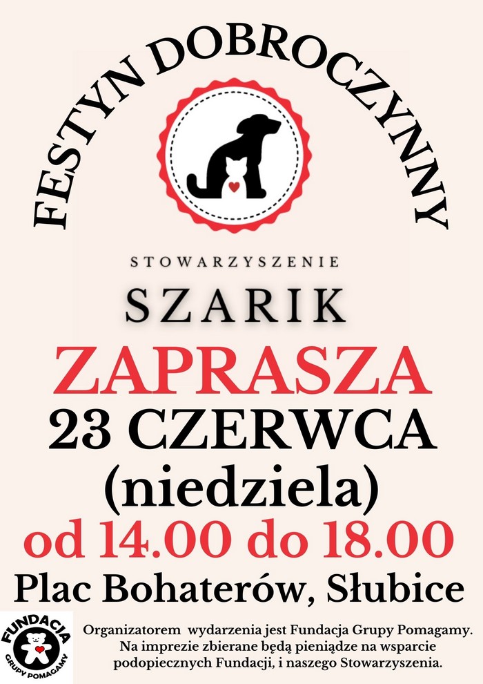 Słubickie Stowarzyszenie na Rzecz Zwierząt „Szarik” oraz Fundacja Grupy Pomagamy organizują bazarek i festyn charytatywny. 23 czerwca na placu Bohaterów będą zbierać środki na zakup najpotrzebniejszych rzeczy dla swoich podopiecznych.
