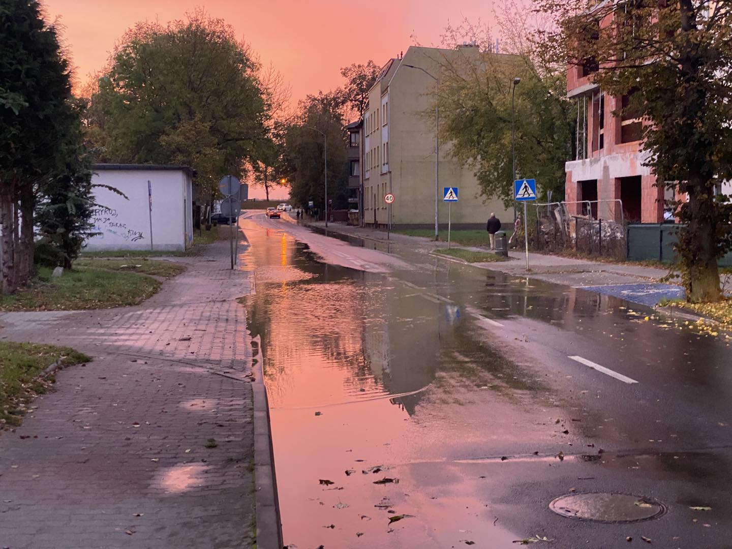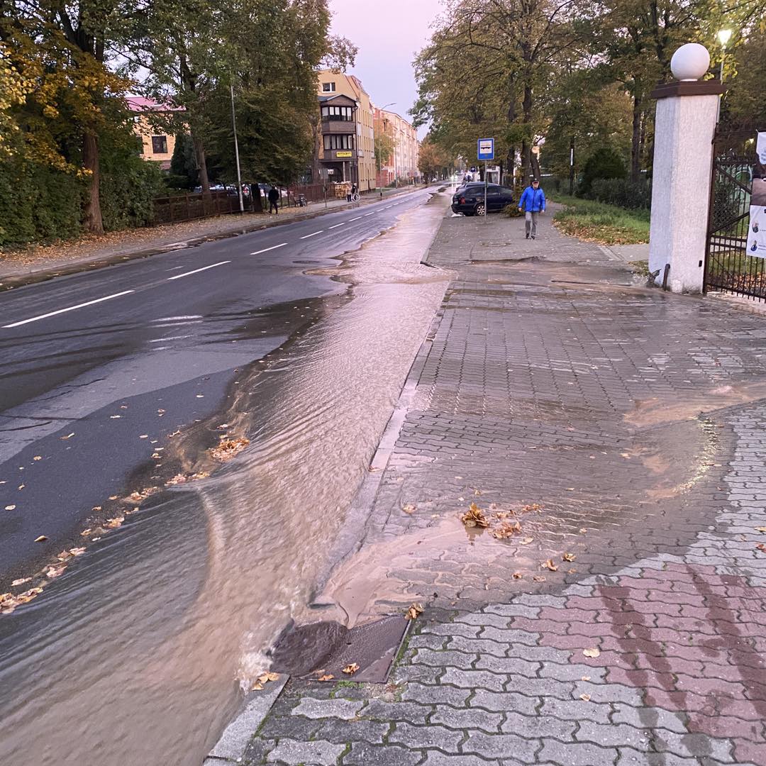 Wyciek pojawił się przy kościele NMP Królowej Polski. Woda zalała fragment jezdni i chodnika, następnie zaczęła spływać aleją Niepodległości.