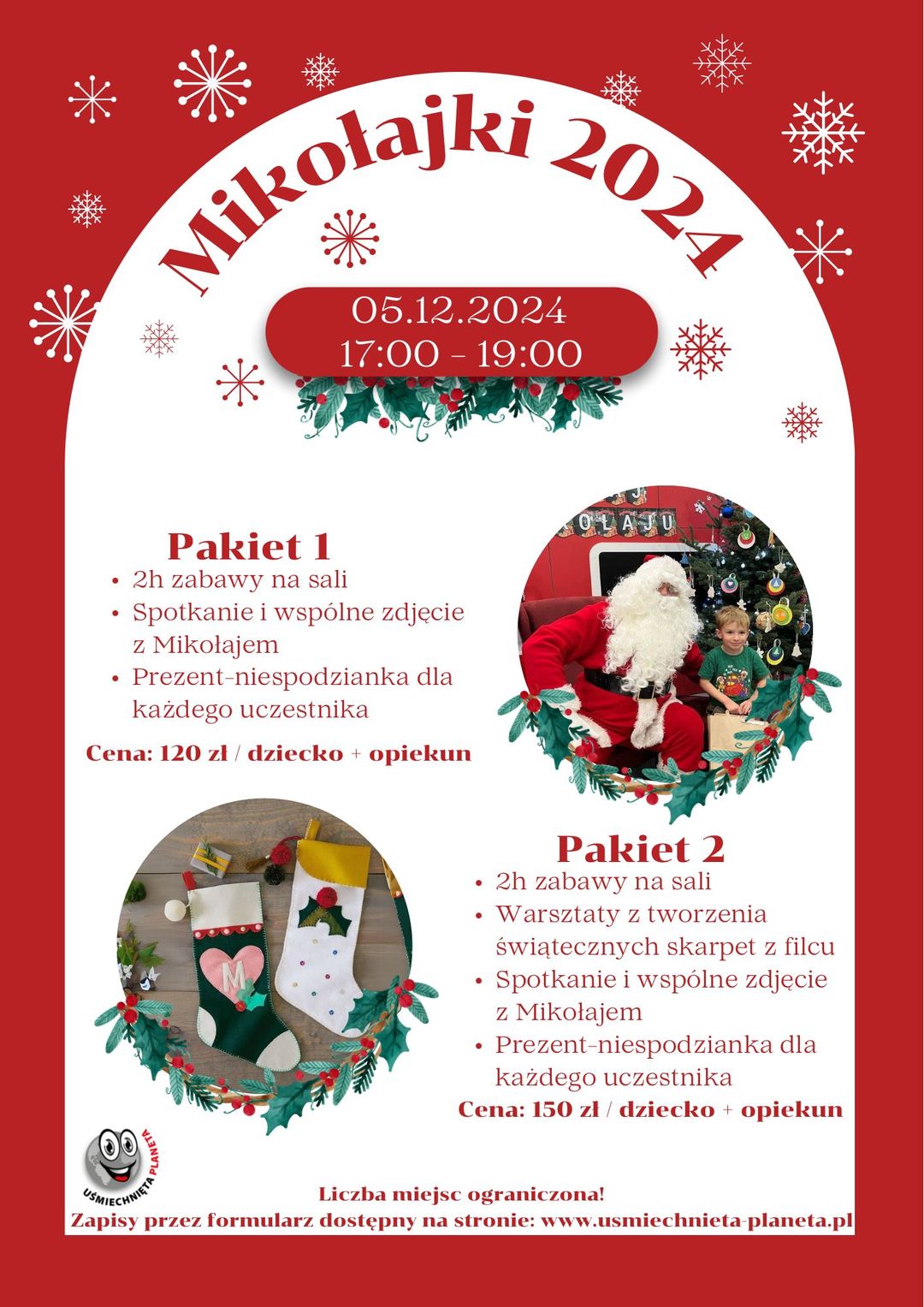 Do wyboru są dwa pakiety. Jeden obejmuje zabawę na sali, prezent oraz spotkanie i zdjęcie z Mikołajem. Drugi poszerzony został o warsztaty tworzenia świątecznych skarpet z filcu.