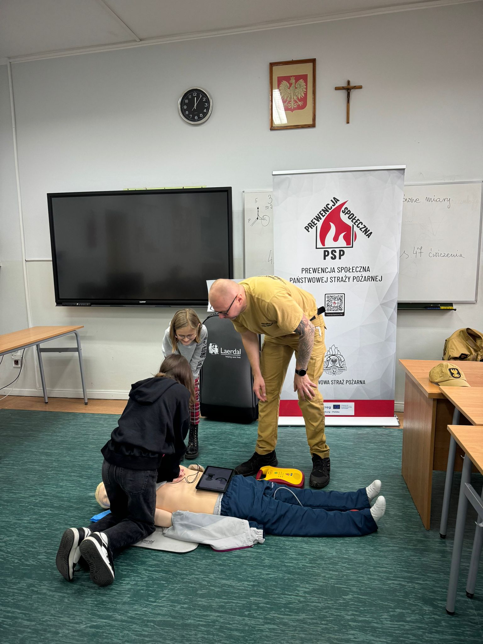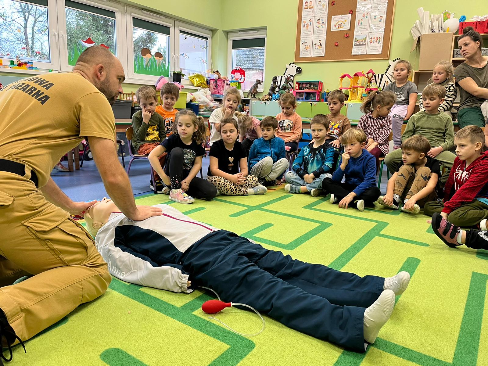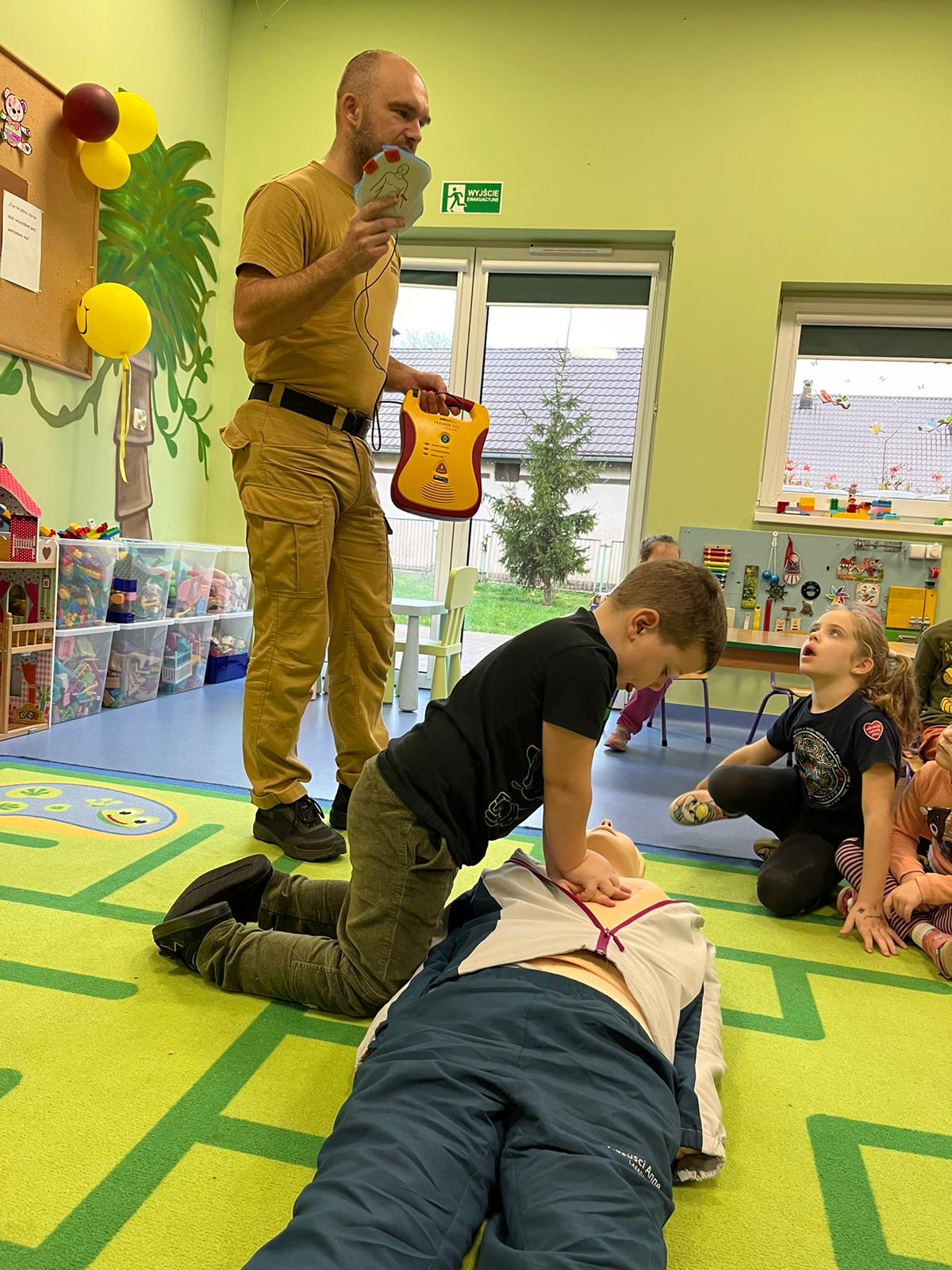 Głównym celem wizyty było przeprowadzenie pokazu z zakresu udzielania pierwszej pomocy, który odbył się z udziałem profesjonalnego fantomu. Dzieci mogły też samodzielnie wykonać masaż serca.