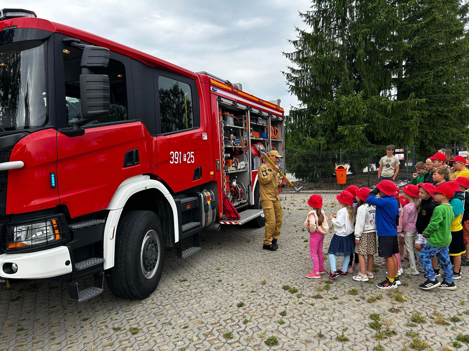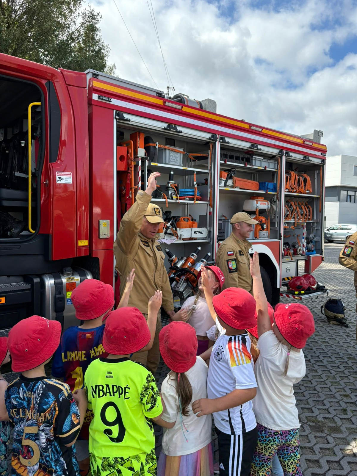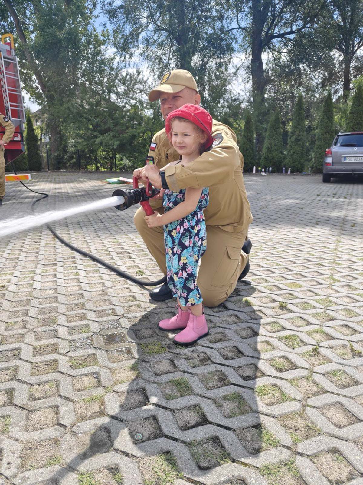 Nie zabrakło też praktyki – najmłodsi mogli przymierzyć strażackie stroje, wejść do wozu i spróbować swoich sił w gaszeniu „pożaru” z węża. Dla wielu była to pierwsza tak bliska styczność ze służbą ratowniczą.
