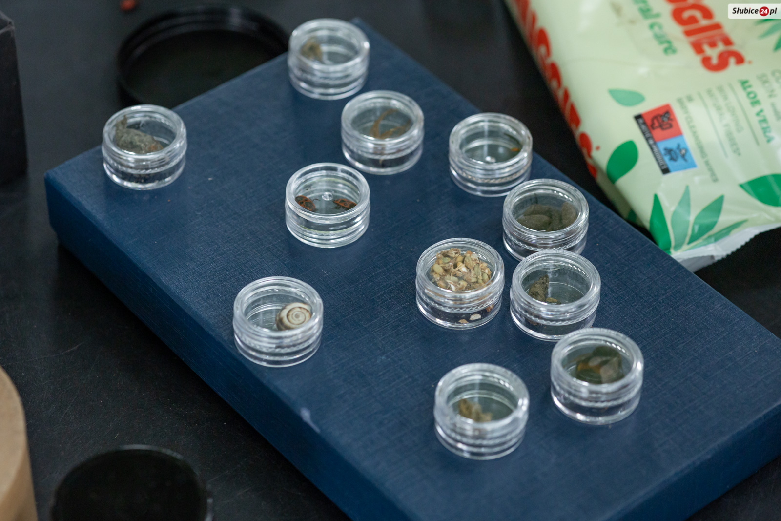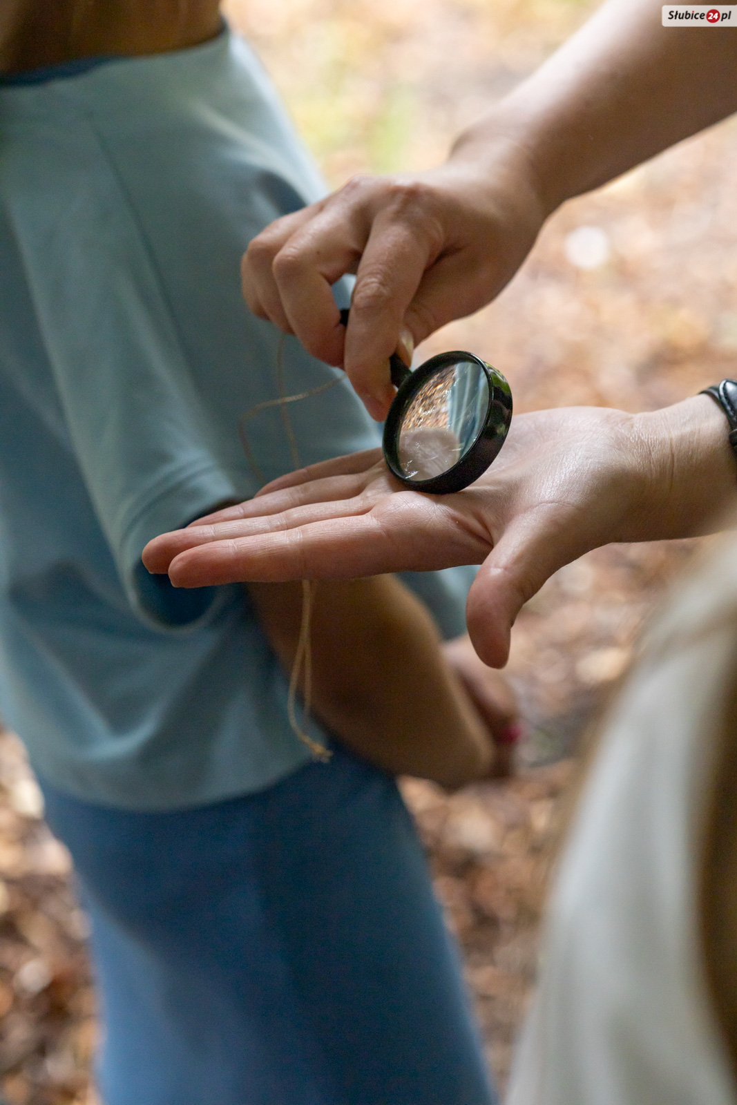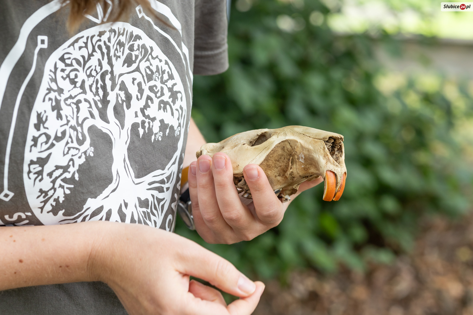 Sporo emocji wzbudziły także eksponaty – czaszka bobra z charakterystycznymi pomarańczowymi zębami, czerwone pióro dzięcioła czarnego (z samego czubka jego głowy), obgryzione szyszki czy owady. Prowadząca pokazała też larwy w liściach kasztanowca, które można było obejrzeć przy pomocy lupy.