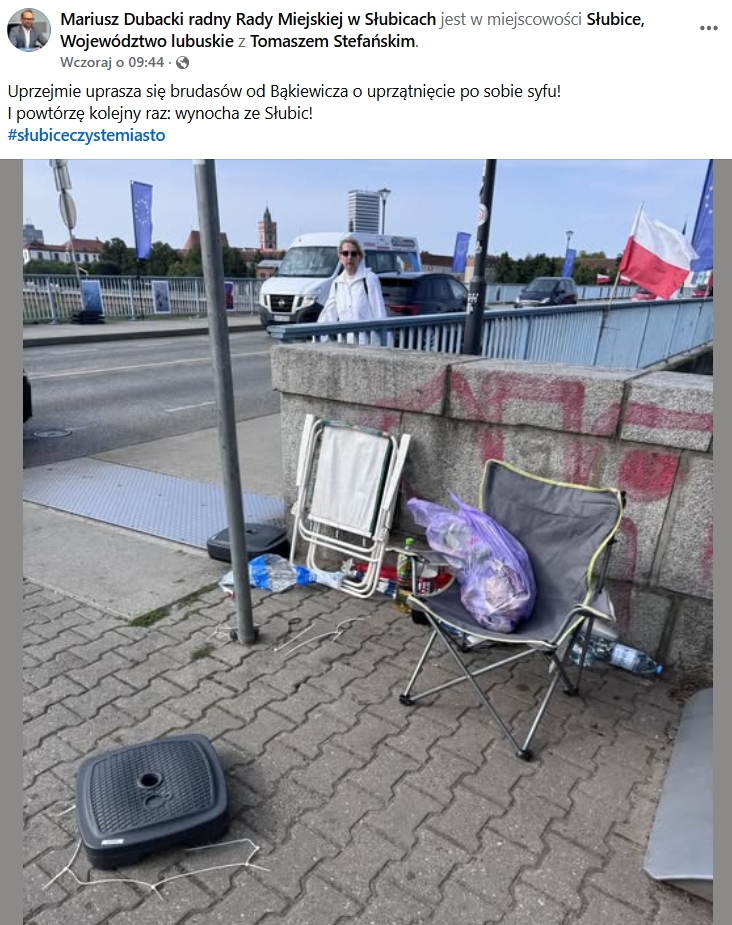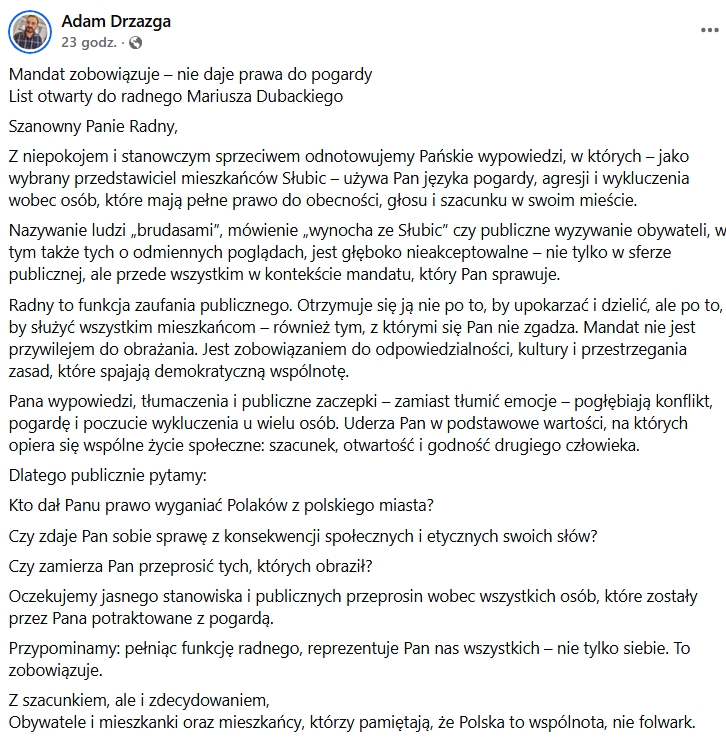 W międzyczasie jeden mieszkańców Słubic, Adam Drzazga, wystosował apel do burmistrzyni Słubic, w którym prosi o „pilną interwencję w sprawie radnego” i podjęcia działań, które „przywrócą szacunek i dialog w naszej gminie i powiecie” (ZOBACZ APEL). Ta sama osoba opublikowała list otwarty do Mariusz Dubackiego, w którym m.in. pisze, że wypowiedzi radnego „zamiast tłumić emocje pogłębiają konflikt, pogardę i poczucie wykluczenia u wielu osób” (ZOBACZ LIST).