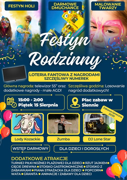 W Siennie szykuje się popołudnie pełne atrakcji dla całych rodzin. 15 sierpnia na placu zabaw odbędzie się Festyn Rodzinny z mnóstwem atrakcji. Organizatorzy zapowiadają zabawy, konkursy i niespodzianki dla uczestników w każdym wieku.