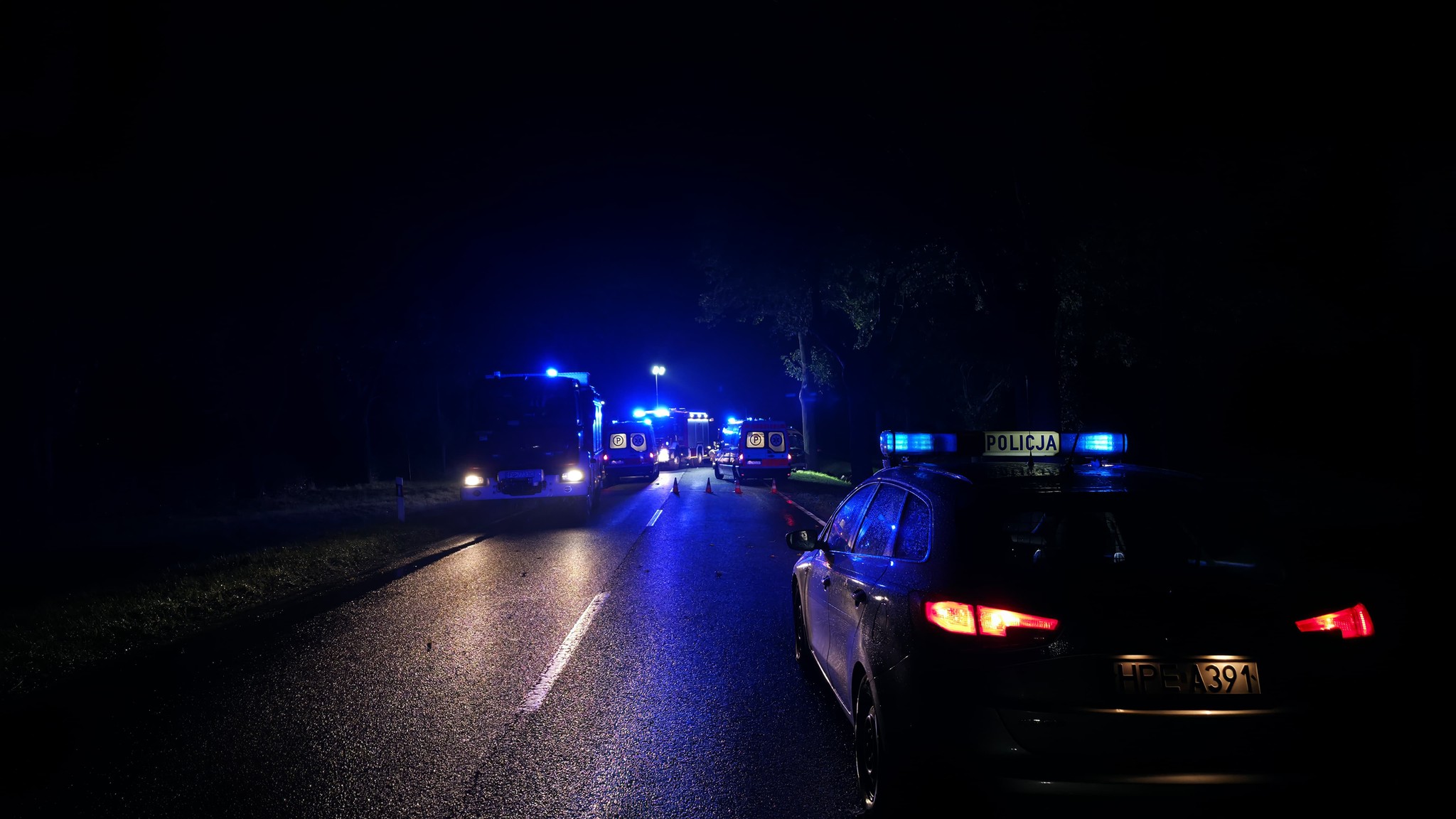 Jak przekazała policja, doszło do zderzenia osobówki z busem, który następnie uderzył w drzewo.