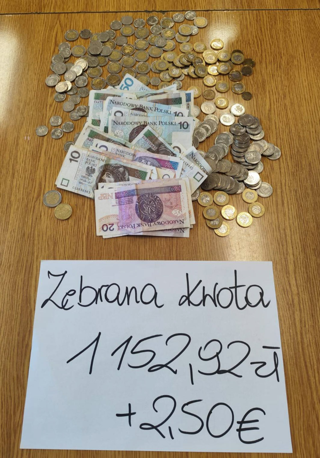 Wspólnie udało się zebrać kwotę 1152,92 zł i 2,50 euro w gotówce, a dodatkowe 97 zł wpłynęło blikiem, co razem dało nieco ponad 1260 zł. Wśród zebranych darów znalazły się również karma i zabawki dla zwierząt.