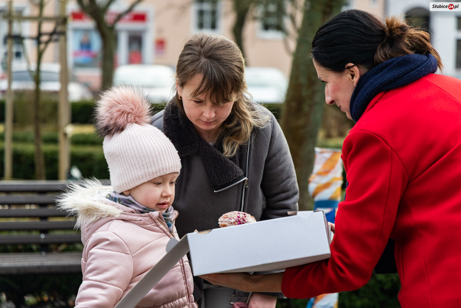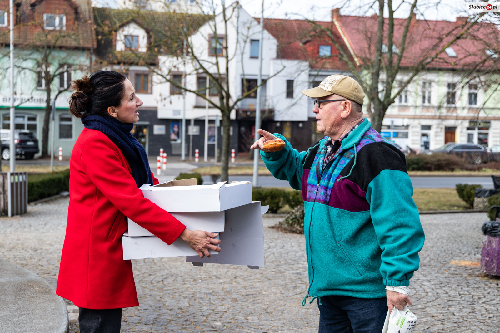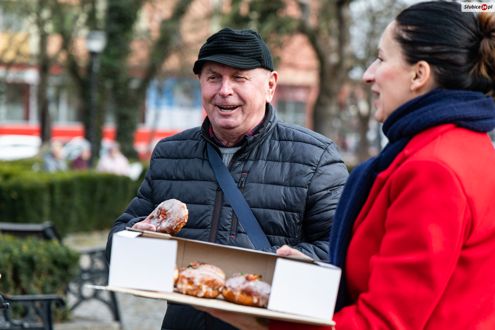 12 lutego na pl. Przyjaźni zrobiło się wyjątkowo słodko. Burmistrzyni Słubic Marzena Słodownik, wspólnie z pracowniczkami Urzędu Miejskiego, częstowała przechodniów pączkami z okazji tłustego czwartku.