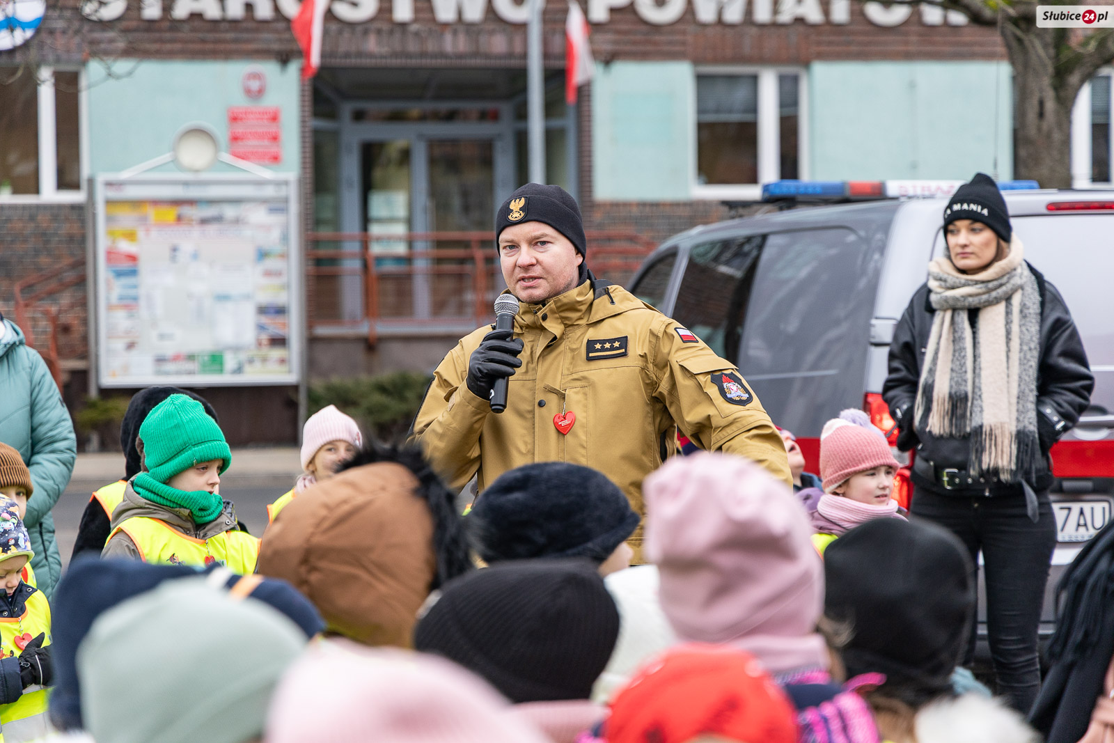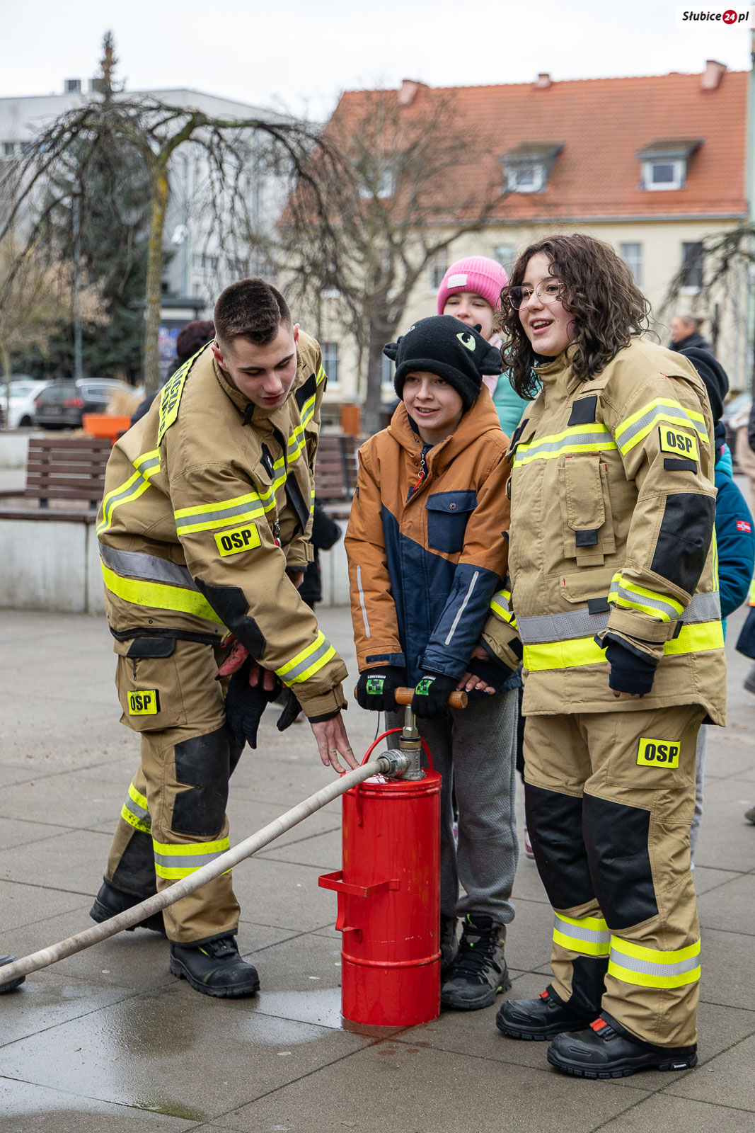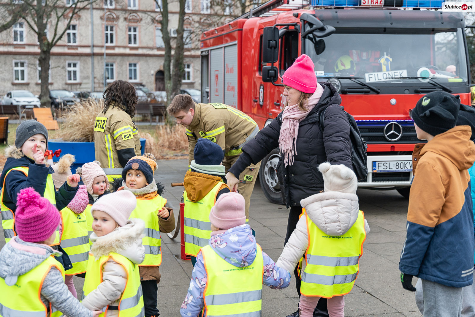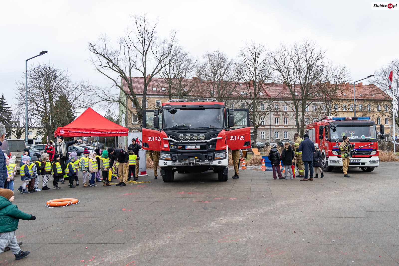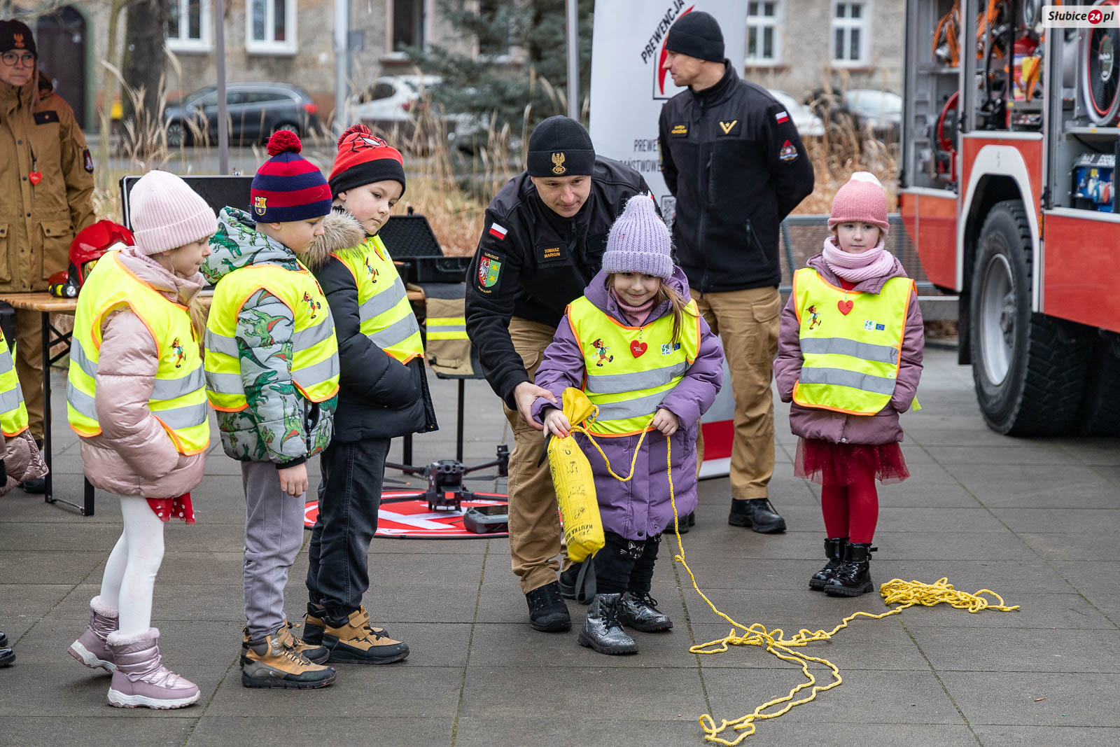 Na placu pojawili się również strażacy z Komendy Powiatowej Państwowej Straży Pożarnej i Ochotniczej Straży Pożarnej w Słubicach. Rzecznik słubickich strażaków Mateusz Maćkowiak rozmawiał z dziećmi o bezpieczeństwie podczas ferii, tłumacząc m.in. zasady ewakuacji czy działanie czujników dymu. Była też rozmowa o numerze alarmowym – Numer 112 łatwo zapamiętać: mamy jedną brodę, jeden nos i dwoje oczu – razem to 1-1-2! – mówiła Monika Chrobak z KP PSP Słubice.