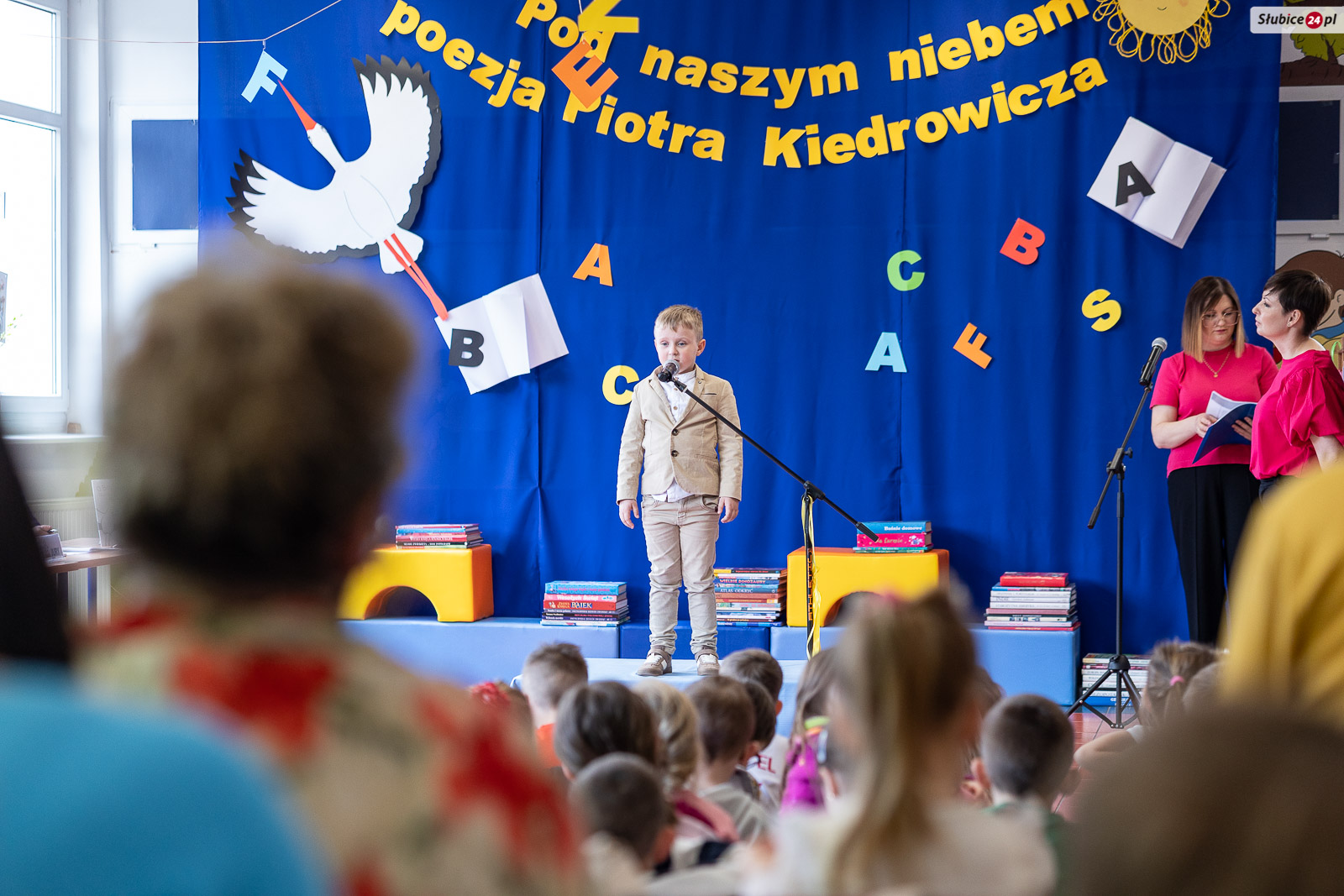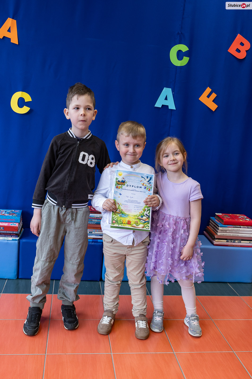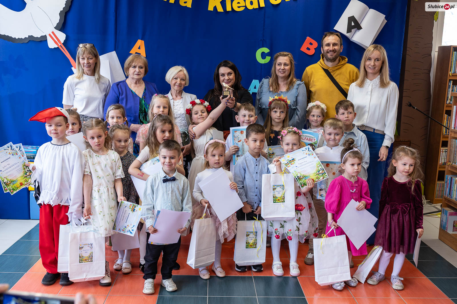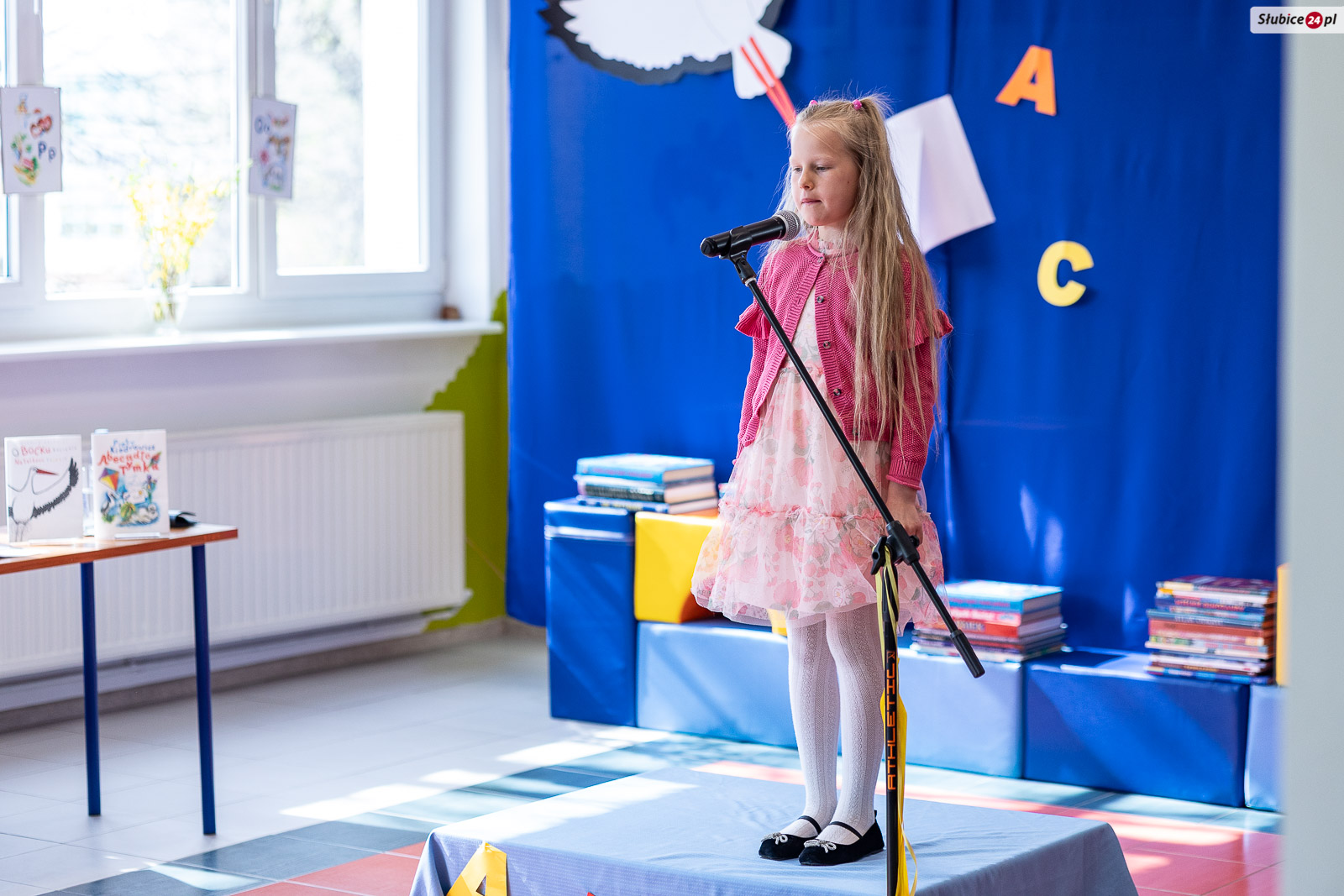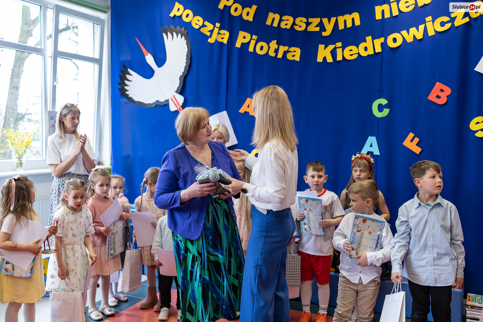 Występom przedszkolaków przysłuchiwała się także burmistrzyni Słubic Marzena Słodownik, która wspólnie z dyrektorką biblioteki Agnieszką Mińską wręczały maluchom nagrody i dyplomy. – Pan Piotr był i sportowcem, i artystą. Cieszę się, że możemy dzisiaj korzystać z jego dorobku – powiedziała burmistrzyni. Na sali był obecny również Marcin Kiedrowicz, syn poety, który przekazał zwyciężczyni nagrodę specjalną – jeden z ostatnich dostępnych egzemplarzy bajki pt. „Abecadło Tymka”.